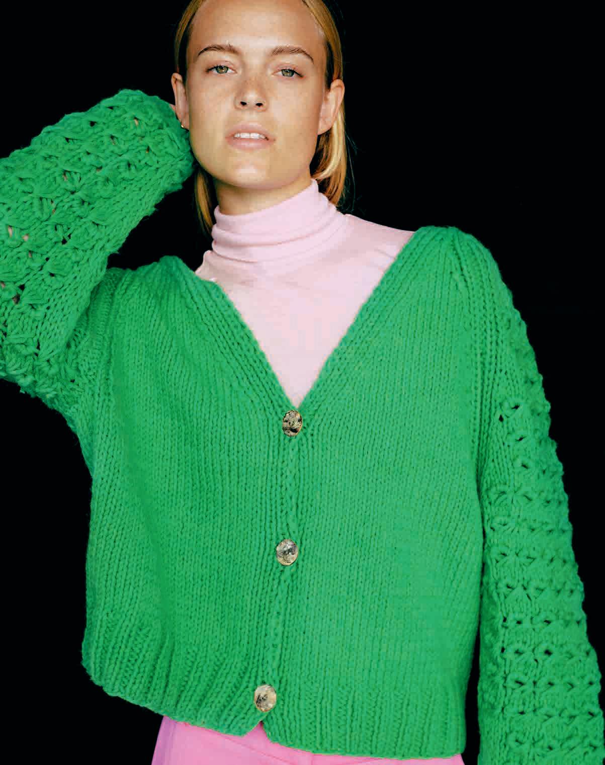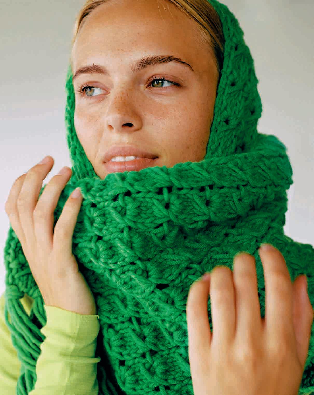 (100 % Schurwolle (Merino), LL = ca 250 m/200 g): ca. 600 g Grün (Fb 10); Stricknadeln Nr 7; Häkelnadel Nr 7.