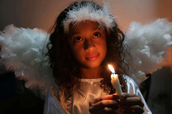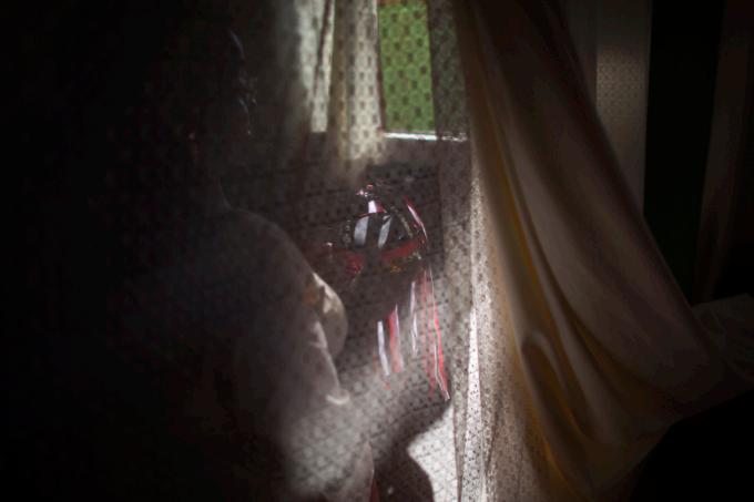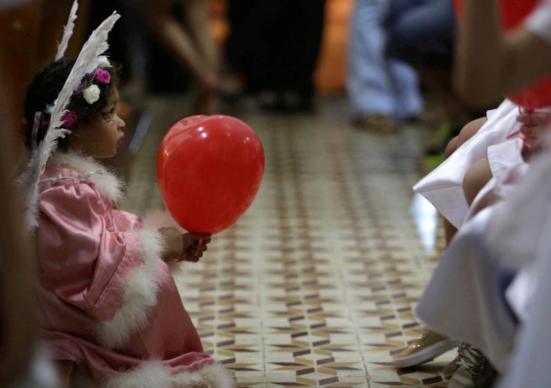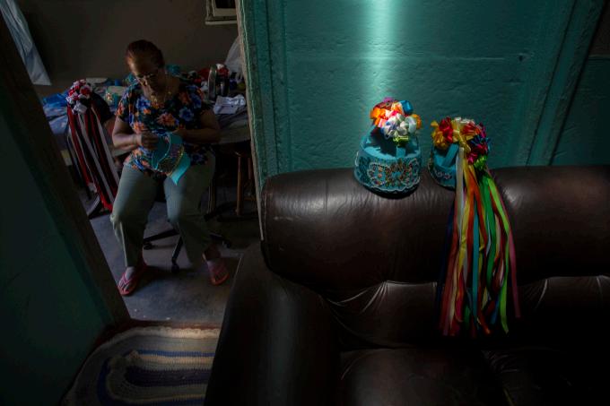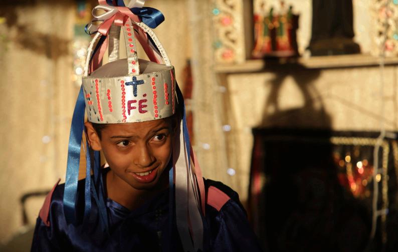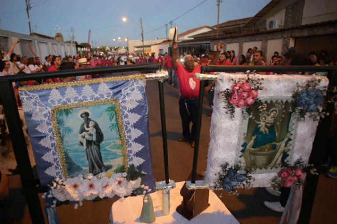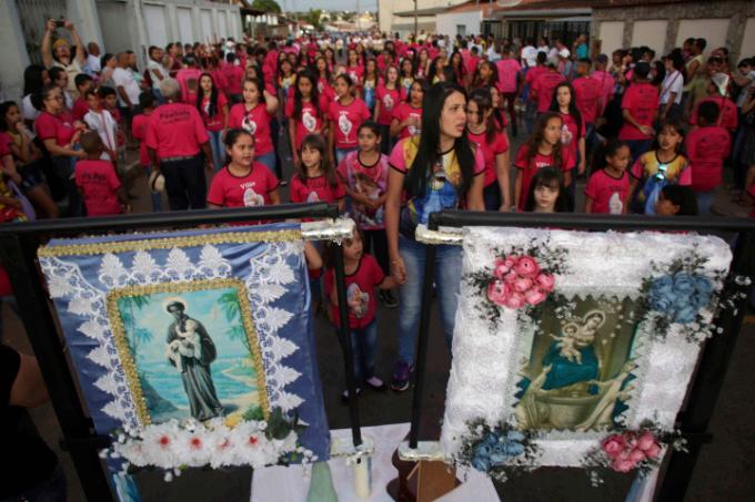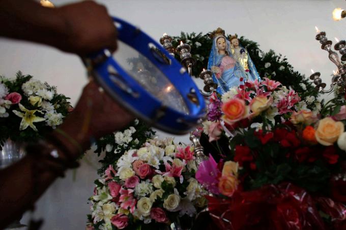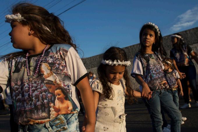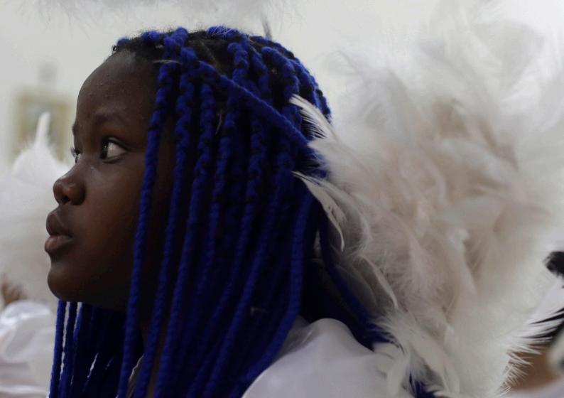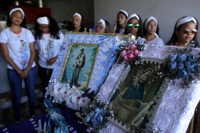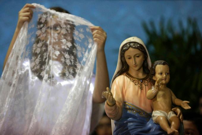 Menina prepara o véu de Nossa Senhora do Rosário para a missa, em Catalão (GO)