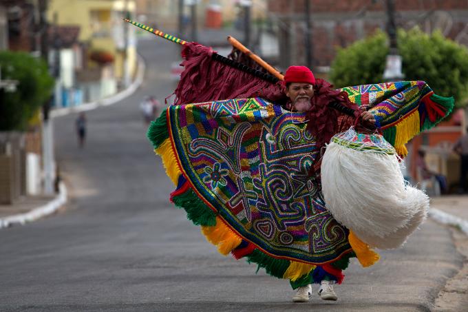 Caboclo de lança – Figura emblemática do maracatu rural, caracterizada por roupas coloridas, chocalhos nas costas, lança decorada e grande cabeleira de fitas.