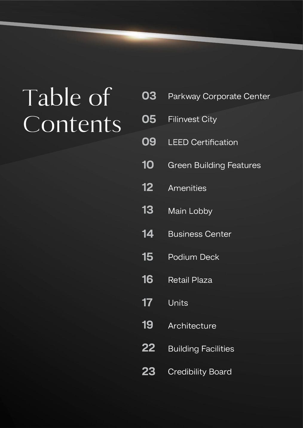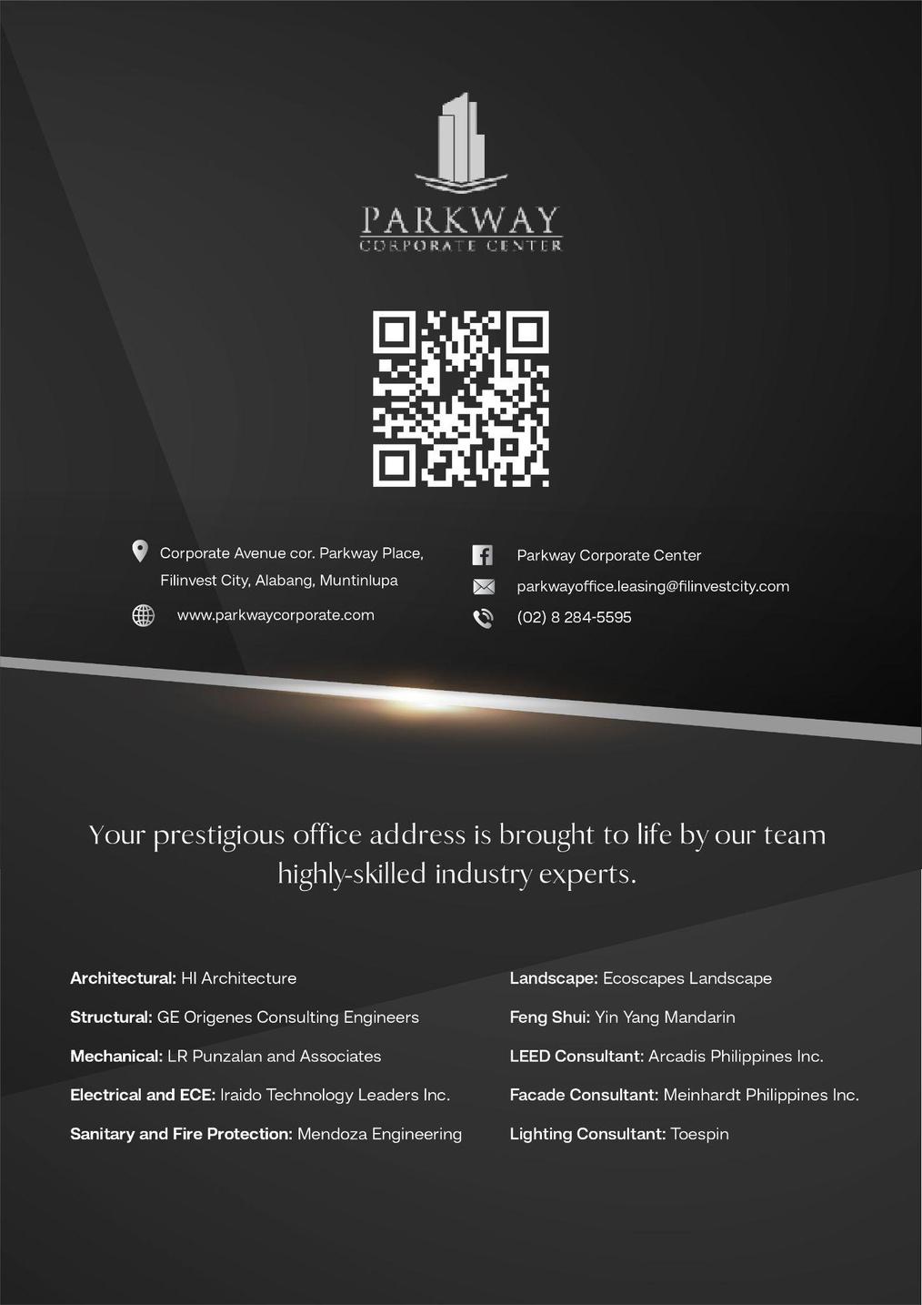 Parkway Corporate Center is a LEED-certified office condominium nestled in Filinvest City, Alabang. Its comprehensive amenities and sustainable building features allow one's work-life balance to come naturally in this new icon in the South's corporate skyline.