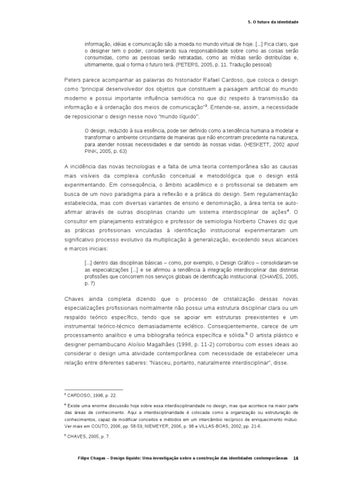 Chaves ainda completa dizendo que o processo de cristalização dessas novas especializações profissionais normalmente não possui uma estrutura disciplinar clara ou um respaldo teórico específico, tendo que se apoiar em estruturas preexistentes e um instrumental teórico-técnico demasiadamente eclético. Conseqüentemente, carece de um processamento analítico e uma bibliografia teórica específica e sólida. 5 O artista plástico e designer pernambucano Aloísio Magalhães (1998, p. 11-2) corroborou com esses ideais ao considerar o design uma atividade contemporânea com necessidade de estabelecer uma relação entre diferentes saberes: “Nasceu, portanto, naturalmente interdisciplinar”, disse.