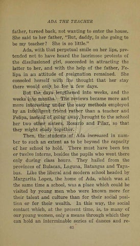 father, turned back, not wanting to enter the house. She said to her father, "But, daddy, is she going: to be my teacher? She is so little." Ada, with that perpetual smile on her lips, prf'tended not to have heard the lacrimose protests of the dissilusioned girl, succeeded in attracting the latter to her, and with the help of the father, Felipa in an attitude of resignation remained. She consoled herself with the thought that her stay there would only be for a few days. But the days lengthened into weeks, and the weeks into months. The reviews became more and more interesting under the easy methods employed by an intell'igent friend rather than a teacher and Felipa, instead of going away, brought to the school her two otner sisters, Rosario and Pilar, so that they might study together. Then, the students of Ada increased in number to such an extent as to be beyond the capacity of her school to hold. There must have been ten or twelve interns, besides the pupils who went there only during class hours. They hailed from the provinces of Bulacan, Laguna, Batangas and Tayabas. Like the liberal and modern school headed by Margarita Lopez, the home of Ada, which was at the same time a school, was a place which could be visited by young men who were known more for their talent and culture than for their social position or for their wealth. In this way, the social contact which, at the present time, is, to many of our young women, only a means through which they can hold an interminable series of dances and re63