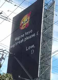 Abillboard along C5, displaying a heartfelt plea from an anonymous individual urging their partner not to end their relationship, has captivated Filipinos online. Situated above Intrepid Plaza in Quezon City, the billboard reads, "'Wag na tayo mag break please :( Love, D," accompanied by a customized broken heart emoji.