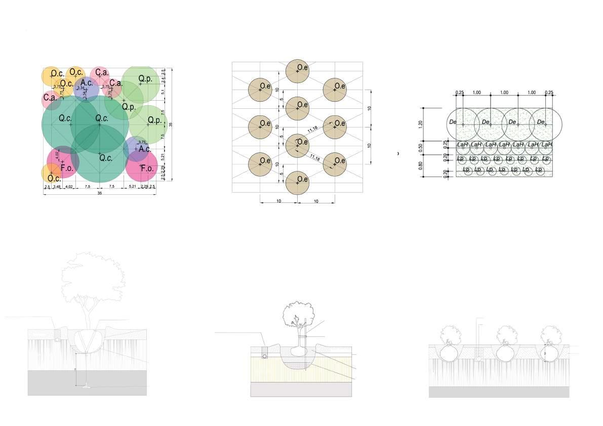 sub-surface drainage topsoil polyester belt filling with topsoil and organic fertilizers binding draining material ( 60-80 mm) sub-surface drainage topsoil rubber pipe pole diam 6 cm drainage layer draining material ( 60-80 mm) filling with topsoil and organic fertilizers drainage pipe draining material ( 20-40 mm ) topsoil mulching Q.C Q.p. F.o. A.c. O.c. C.a Quercus cerris Quercus pubescens Fraxinus ornus Acer campestre Ostrya carpinifolia Corylus avellana