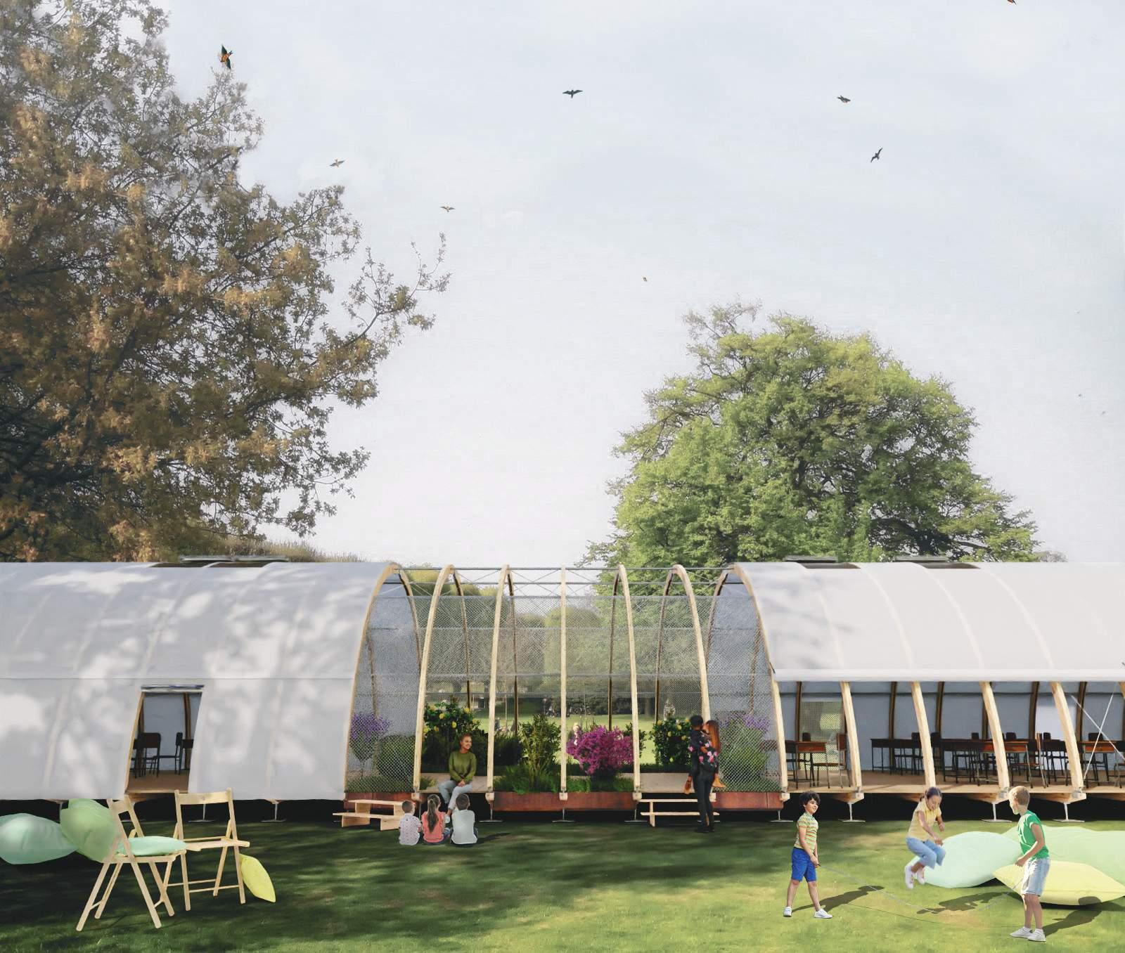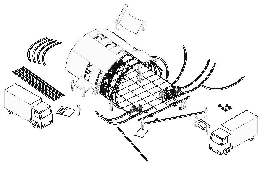 a great deal of work to reduce the weights and dimensions of the elements to the minimum possible. The three-hinged arch structure and the floor are made of wood, while the cladding is a mix of layers of poly-cotton and PET-based insulation with an interposed three-dimensional fabric to ensure the effectiveness of the closure package in as many climates as possible. All construction phases were designed to be carried out by unskilled labor, such as civilians.