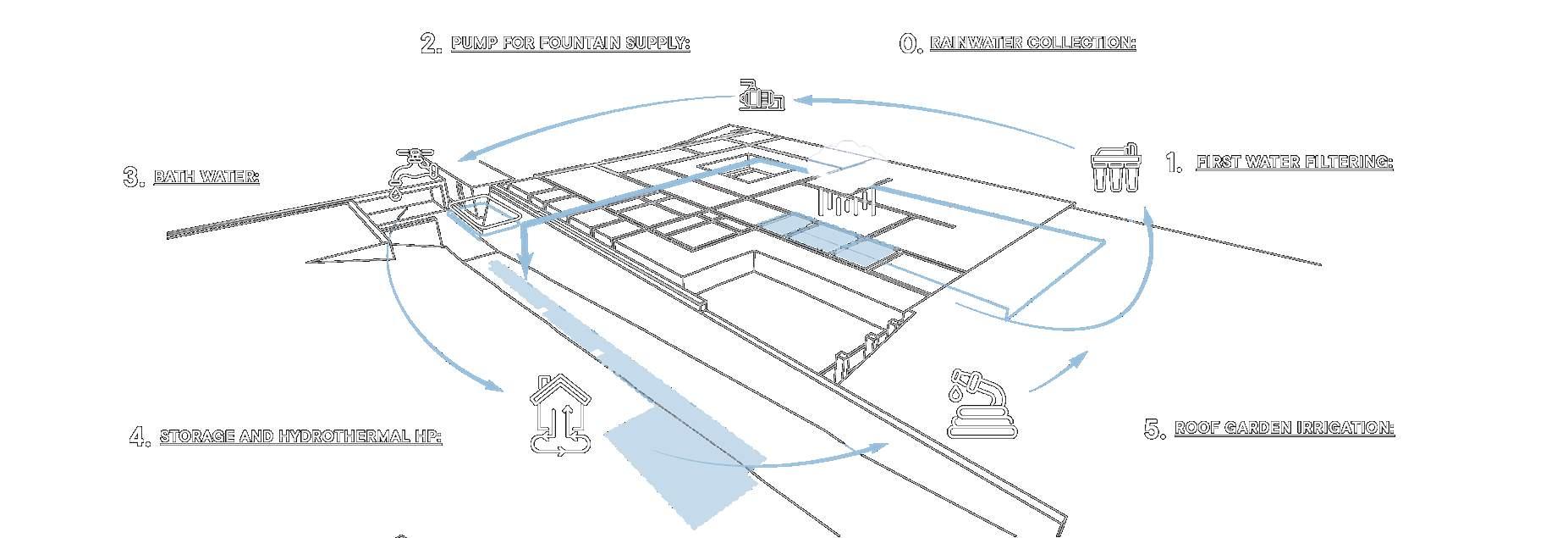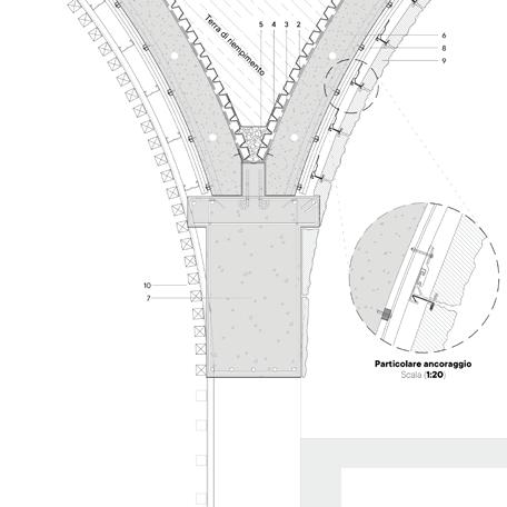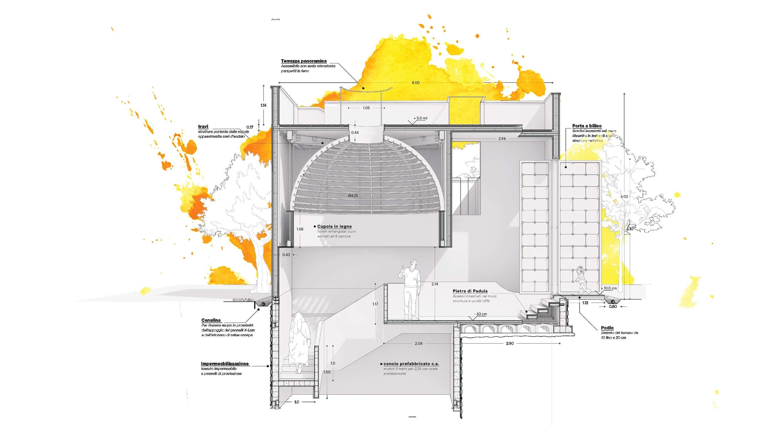 The roof is constructed at ground level to be not only fully integrated with the magnificent Vesuvius landscape but also easily accessible for both visits and green maintenance. The rainwater collection system feeds the underlying tanks, while two parallel rows of walkable photovoltaic panels power the museum’s nighttime lighting.