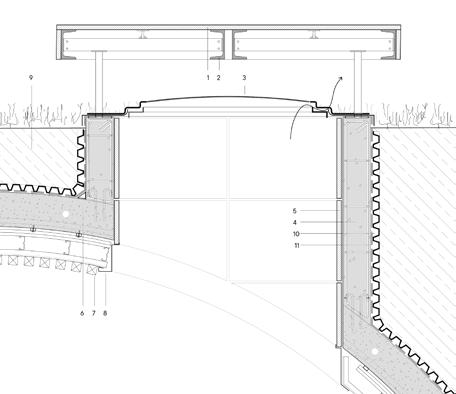 The roof, made of double-height cellular beams measuring almost 2 meters, has been meticulously designed and sized to ensure it can be entirely walkable and a green roof. This way, visitors arriving on foot from the countryside do not realize they are walking on the remains of the villa until they come across the numerous glazed openings aligned with the underlying walls of the villa. This design recreates the spatial layout of the covered villa on the rooftop lawn