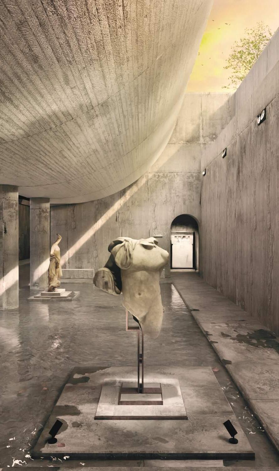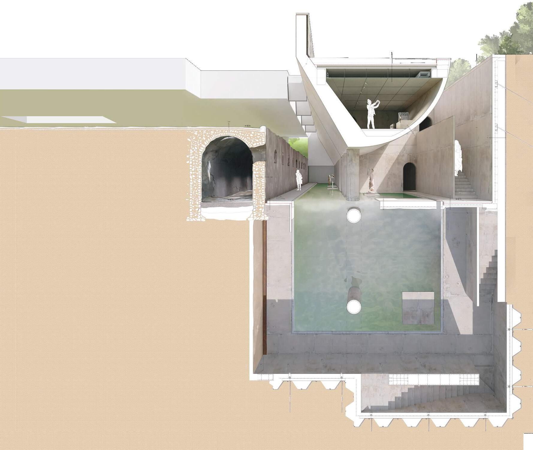 The newly constructed museum spaces are situated in front of the ancient terrace overlooking the Gulf of Naples and are positioned beneath a sloped wall. This wall not only supports the roof but also reflects the play of light evoking the ancient sea view from the pool below onto its inclined surface.