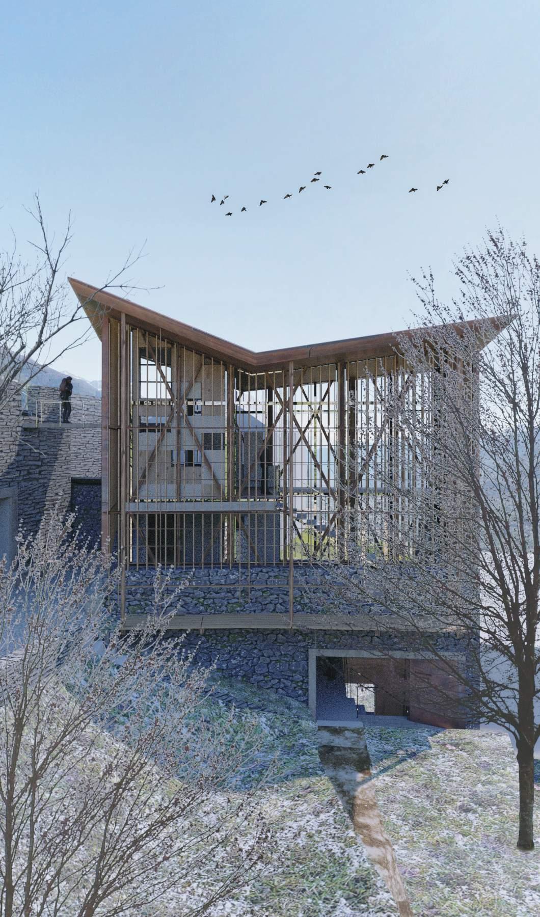 The reuse project of the stone ruin involves its consolidation on the first and second floors, and a structure that rises two additional floors solely supported by the new structures. The language of the new construction is closely tied to the traditional local architecture, and the spaces on the upper floors enjoy a 180-degree view of the surrounding valley thanks to glass walls inspired by hay drying barns of the village.
