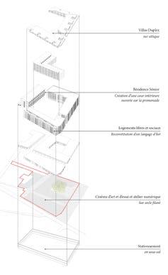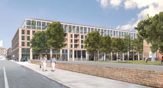 The project is located in the heart of the city of Toulouse, in the Saint Cyprien district. The site is situated along the Garonne River and faces one of the city’s iconic landmarks: the dome of La Grave. The project involves the redevelopment of a site formerly occupied by the city’s hospital. The planned program is mixeduse, including a hotel residence, ground-floor commercial spaces, and residences spanning five levels and an attic. The layout recalls the typology of a cloister and also creates a new pedestrian passage connecting the development to the new green spaces around the La Grave monument and the Abattoirs Museum Park.