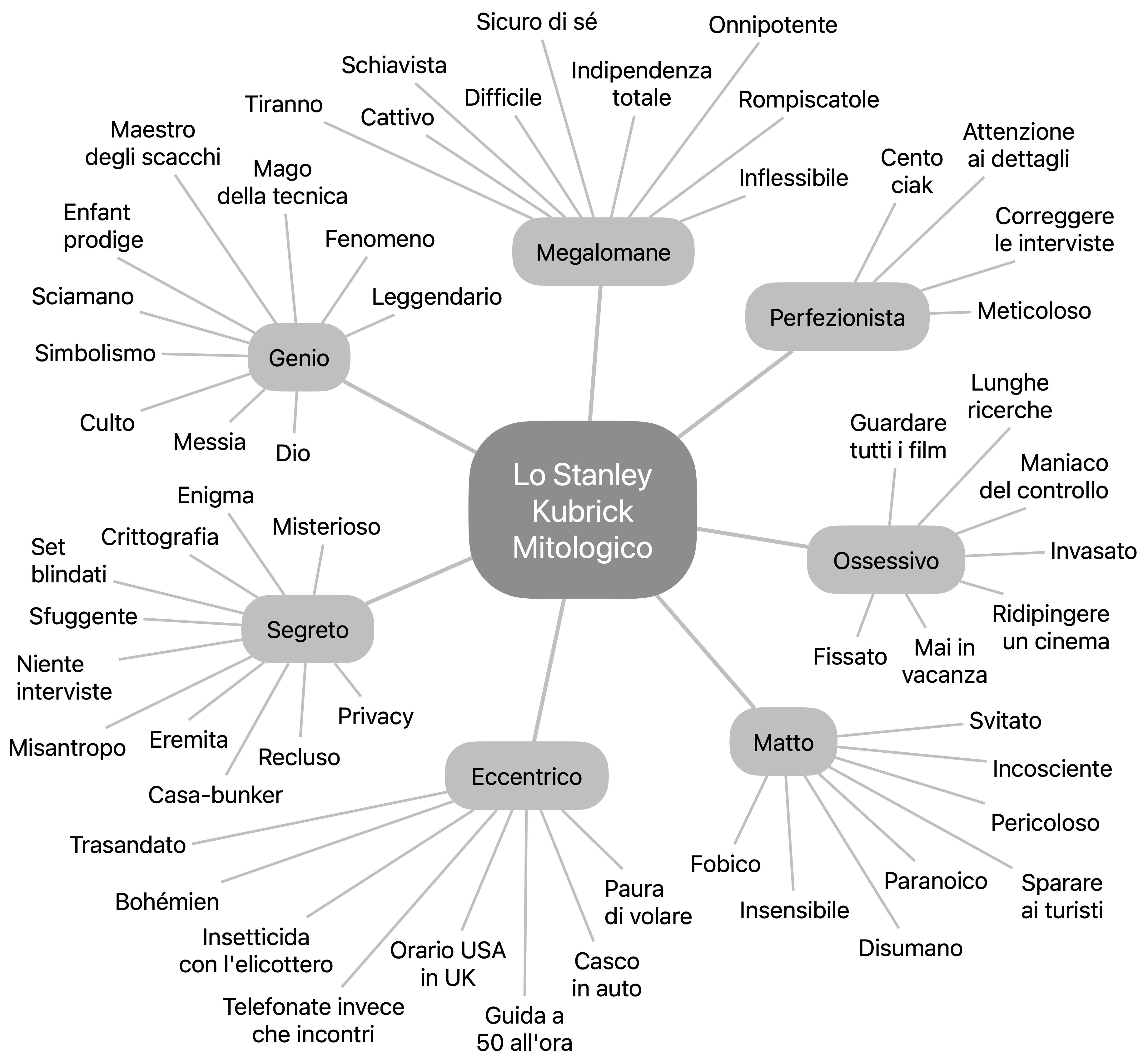 Nel corso degli anni è stato descritto in modi variopinti: “bohémien” e “trasandato” ma anche “meticoloso” e “preciso;” “allampanato” e “spelacchiato,” “minuto” eppure “imponente.” Per molti era “difficile” e “severo,” “un boss tirannico” con gli attori e collaboratori, talvolta addirittura “crudele” o “sadico.” Senza ombra di dubbio era “un maestro della tecnica cinematografica.” Notoriamente “un perfezionista,” prestava “un’attenzione smisurata” a “ogni più piccolo dettaglio” presente nei suoi film. Secondo altri era piuttosto “un maniaco del controllo,” magari perfino un po’ “paranoico.” Da quando si “esiliò volontariamente” in Inghilterra, Kubrick divenne un uomo sempre più “alienato” dal mondo, che concedeva “rare interviste” e “non usciva mai di casa” – meglio: “un misantropo” “agorafobico” di cui “nessuno sapeva più che aspetto avesse.” Quello che era stato “un ragazzo prodigio” a inizio carriera, si era trasformato piuttosto alla svelta in un “fenomeno” di “proporzioni mitiche,” “sensazionale,” “inconoscibile,” un “auteur” “criptico” e “geniale,” praticamente “il dio del cinema.”