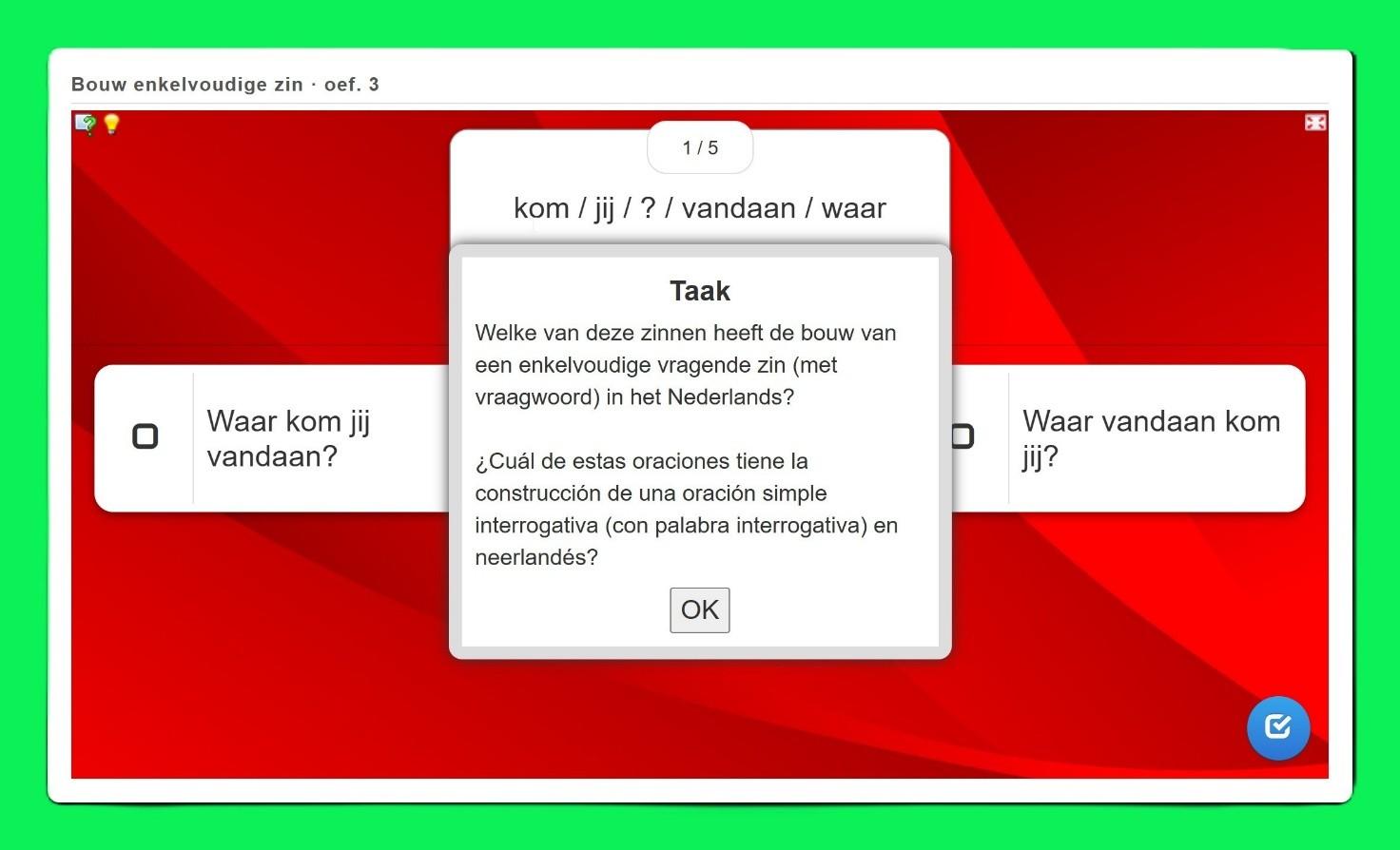 Welke van deze zinnen heeft de bouw van een enkelvoudige vragende zin (met vraagwoord) in het Nederlands? - ¿Cuál de estas oraciones tiene la construcción de una oración simple interrogativa (con palabra interrogativa) en neerlandés?