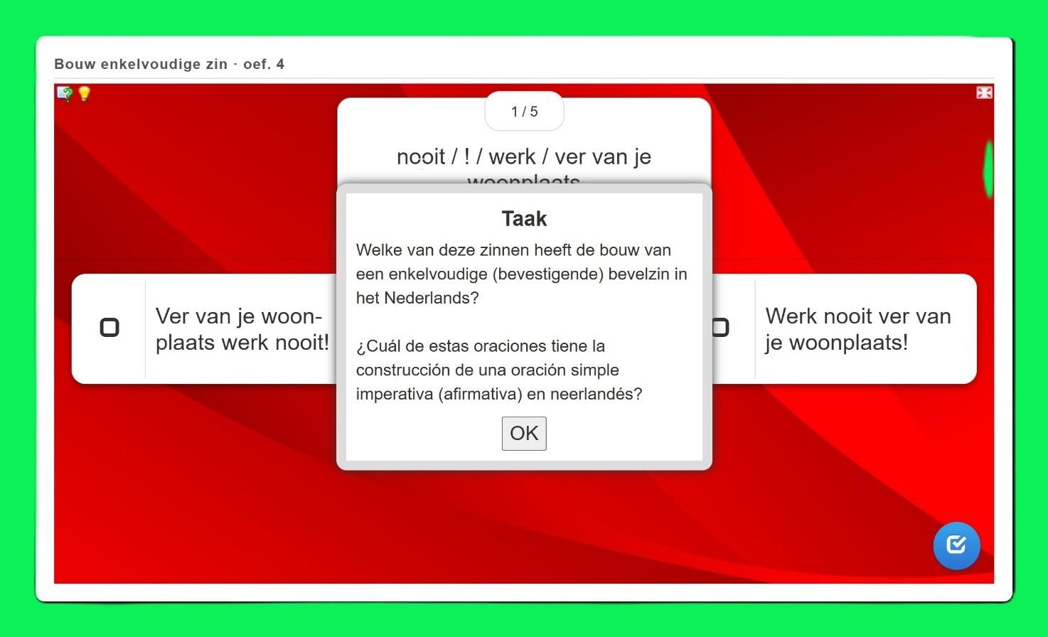 Welke van deze zinnen heeft de bouw van een enkelvoudige (bevestigende) bevelzin in het Nederlands? - ¿Cuál de estas oraciones tiene la construcción de una oración simple imperativa (afirmativa) en neerlandés?