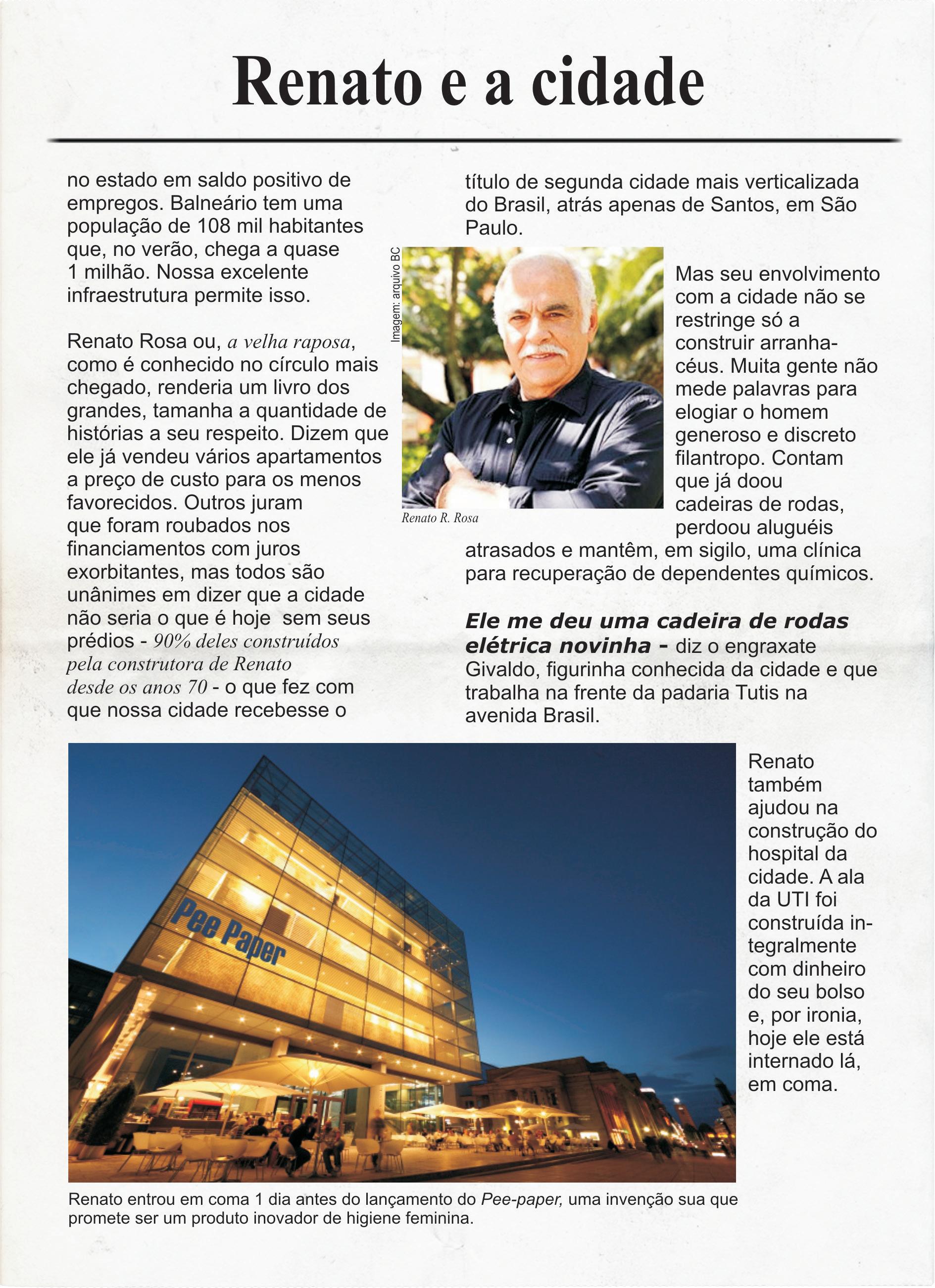 A cidade crescia ao longo dos quase oito quilômetros de orla. Havia ruas e lugares privilegiados. A Avenida Atlântica separava o calçadão da praia dos altos e luxuosos prédios, com suas enormes sacadas com vista para o mar e para a “Ilha das Cabras”, a pouco mais de seiscentos metros da praia, quase que exatamente na metade da extensa faixa de areia. Paralela a esta, prolongava-se a Avenida Brasil e seus cafés, e o encontro do solitário shopping center, do comércio elitista e suas grifes, e dos prédios de classe média-alta antropofágica, meio pós-consumo. Em seguida e também paralela a ela, surgiu a Terceira Avenida, que foi assim batizada por ser a terceira avenida depois da praia. Nela, o comércio em geral era mais modesto e com preços mais frugais; os prédios, já na maioria com apartamentos sem sacada, eram a solução parca de moradia do balneário. Na luta entre o sonho e a realidade, furtiva e calma, ela se impunha.