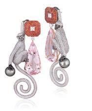 Brilliant Morganite Beryls. These earrings are inspired by India’s leaping Langurs - a monkey breed which is popularly known to be pesky and playful. They also are known to be the embodiment of the Hindu God Hanuman, and it is said that the lively traits of the Langur are actually Hanuman making himself known to man. This piece of jewellery when worn or admired closely shows this sacred animal displaying its most well-known trait - playful teasing!