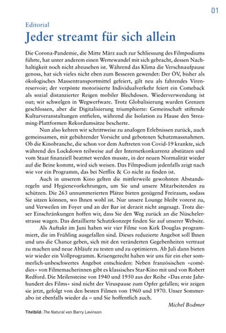 Jeder streamt für sich allein Die Corona-Pandemie, die Mitte März auch zur Schliessung des Filmpodiums führte, hat unter anderem einen Wertewandel mit sich gebracht, dessen Nachhaltigkeit noch nicht abzusehen ist. Während das Klima die Verschnaufpause genoss, hat sich vieles nicht eben zum Besseren gewendet: Der ÖV, bisher als ökologisches Massentransportmittel gefeiert, gilt neu als fahrendes Viren reservoir; der verpönte motorisierte Individualverkehr feiert ein Comeback als sozial distanzierter Reigen mobiler Blechdosen. Wiederverwendung ist out; wir schwelgen in Wegwerfware. Trotz Globalisierung wurden Grenzen geschlossen, aber die Digitalisierung triumphierte: Gemeinschaft stiftende Kulturveranstaltungen entfielen, während die Isolation zu Hause den Streaming-Plattformen Rekordumsätze bescherte. Nun also kehren wir schrittweise zu analogen Erlebnissen zurück, auch gemeinsamen, mit gebührender Vorsicht und gebotenen Schutzmassnahmen. Ob die Kinobranche, die schon vor dem Auftreten von Covid-19 krankte, sich während des Lockdown teilweise auf der Internetkonkurrenz abstützen und vom Staat finanziell beatmet werden musste, in der neuen Normalität wieder auf die Beine kommt, wird sich weisen. Das Filmpodium jedenfalls zeigt nach wie vor ein Programm, das bei Netflix & Co nicht zu finden ist. Auch in unserem Kino gelten die mittlerweile gewohnten Abstands regeln und Hygienevorkehrungen, um Sie und unsere Mitarbeitenden zu schützen. Die 263 unnummerierten Plätze bieten genügend Freiraum, sodass Sie sitzen können, wo Ihnen wohl ist. Nur unsere Lounge bleibt vorerst zu, und Verweilen im Foyer und an der Bar ist derzeit nicht angesagt. Trotz dieser Einschränkungen hoffen wir, dass Sie den Weg zurück an die Nüscheler strasse wagen. Das detaillierte Schutzkonzept finden Sie auf unserer Website. Als Auftakt im Juni haben wir vier Filme von Kirk Douglas programmiert, die im Frühling ausgefallen sind. Dieses reduzierte Angebot soll Ihnen und uns die Chance geben, sich mit den veränderten Gegebenheiten vertraut zu machen und neue Abläufe zu testen und zu optimieren. Ab Juli dann b ieten wir wieder ein Vollprogramm. Krisengerecht haben wir uns für ein eher sommerlich-unbeschwertes Angebot entschieden: Neben französischen «comédies» von Filmemacherinnen gibt es klassisches Star-Kino mit und von Robert Redford. Die Meilensteine von 1940 und 1950 aus der Reihe «Das erste Jahrhundert des Films» sind nicht der Viruspause zum Opfer gefallen; wir zeigen sie jetzt, gefolgt von den besten Filmen von 1960 und 1970. Unser Sommerabo ist ebenfalls wieder da – und Sie hoffentlich auch. Michel Bodmer Titelbild: The Natural von Barry Levinson