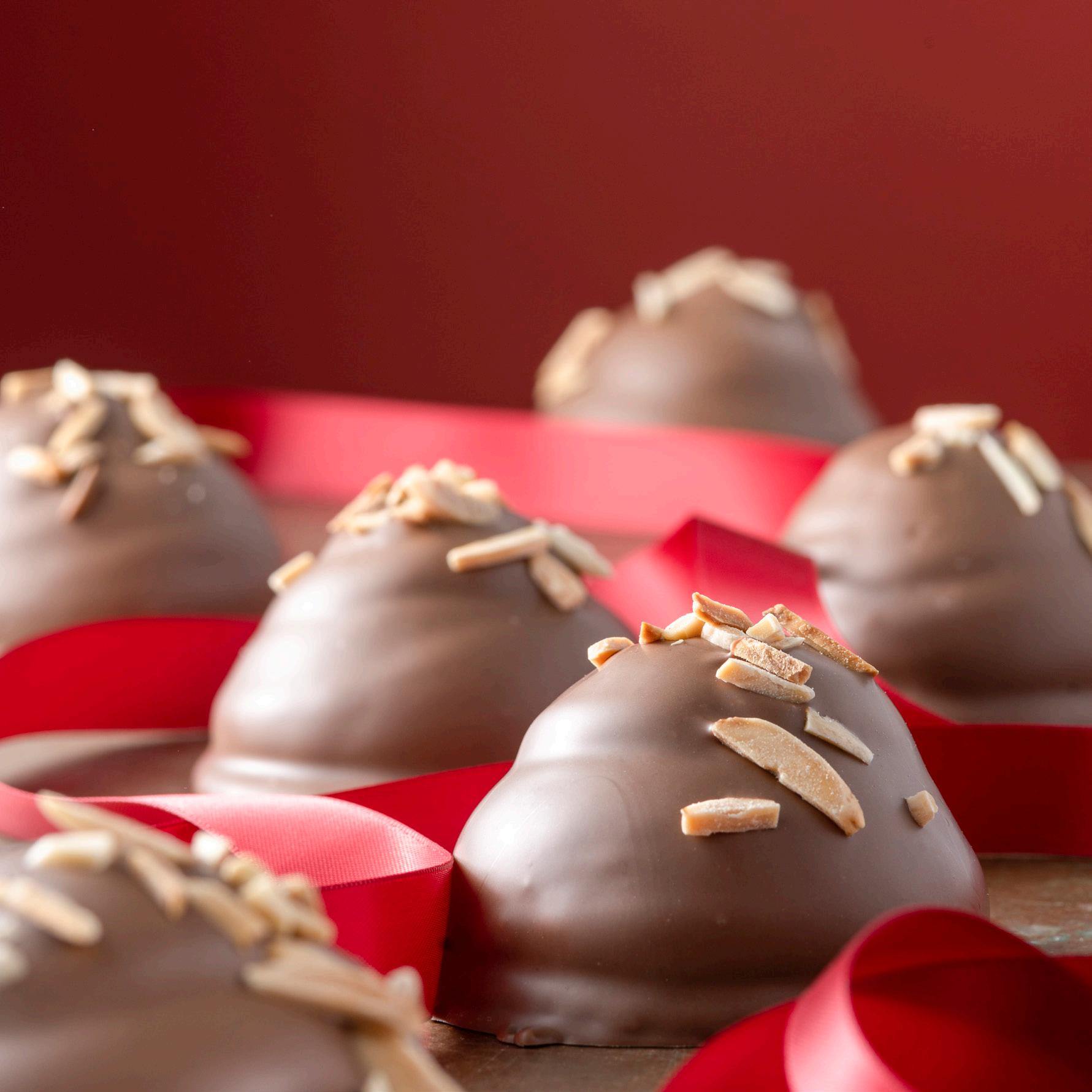 HÅNDDEKORERET MARCIPANJULETRÆ OVERTRUKKET MED MØRK CHOKOLADE, DEKORERET MED HVID CHOKOLADE OG RØDE SPRØDE JULEKUGLER.