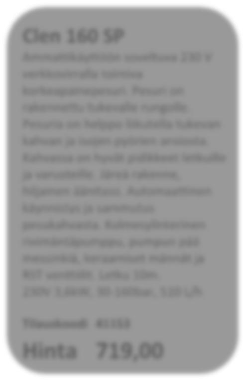 Ammattikäyttöön soveltuva 230 V verkkovirralla toimiva korkeapainepesuri. Pesuri on rakennettu tukevalle rungolle. Pesuria on helppo liikutella tukevan kahvan ja isojen pyörien ansiosta. Kahvassa on hyvät pidikkeet letkuille ja varusteille. Järeä rakenne, hiljainen äänitaso. Automaattinen käynnistys ja sammutus pesukahvasta. Kolmesylinterinen rivimäntäpumppu, pumpun pää messinkiä, keraamiset männät ja RST venttiilit. Letku 10m. 230V 3,6kW, 30‐160bar, 510 L/h Tilauskoodi41153