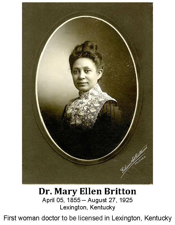 Dr. Mary Ellen Britton (1855-1925) was born in Lexington She was a graduate of Berea College and later returned to Lexington. She was an activist and a journalist who authored many articles against segregation laws. Britton was also a schoolteacher. She would later become the first African American woman physician in Lexington and one of the founders of the Colored Orphan Industrial Home. She is buried in the Cove Haven Cemetery in Lexington and in 1893 she became a member of the Seventh Day Adventist Church.