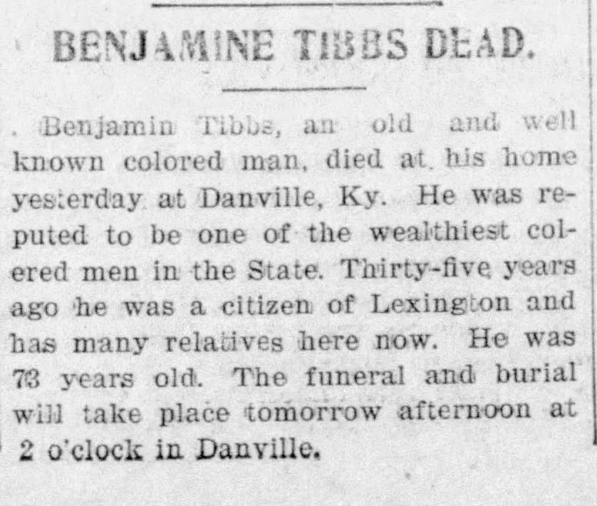 "BenjaminTibbsfuneralatSt.JamesAMEDanville,KY."Newspapers.com,Kentucky Advocate,January19,1898,https://www.newspapers.com/article/kentucky-advocatebenjamin-tibbs-funeral/127655490/.
