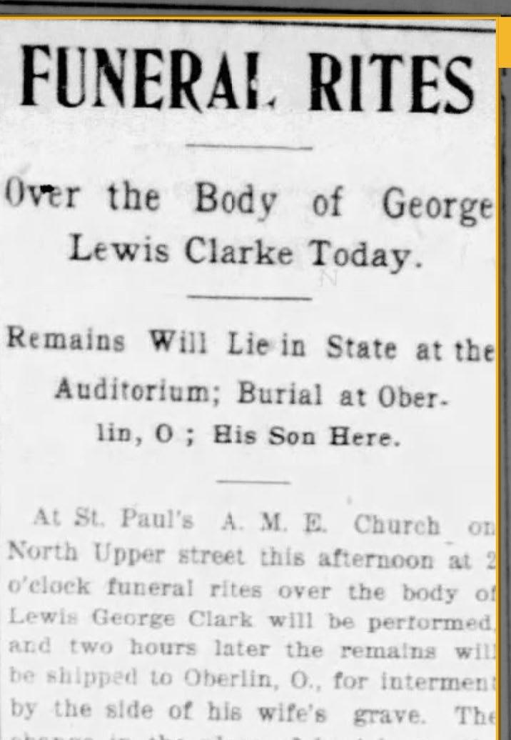 January 1897, George Lewis Clarke (1815-1897): Clarke returned to Historic St. Paul AME Church in Lexington and remained until his death on Dec 17, 1897, at age 82. His body was laid in state at Transylvania University Auditorium for well-wishers to pay their respects, the highest honor ever given to a Black person at that time. In addition, he was eulogized by newspapers around the country. His funeral was held at HSPAME, after which his body was returned to Oberlin, OH for burial by his wife.