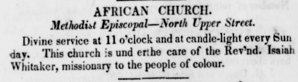 by MacCabe, Julius P. Bolivar lists HSPAME as "African Church Methodist Episcopal North Upper St." It was also written "in the care of the Reverend Isaiah Whitaker missionary to the people of colour" on page 86. ” Divine services at 11 o'clock and candle-light every Sunday. This church is under the care of the Rev'nd. Isaiah Whitaker, missionary to the people of colour.”