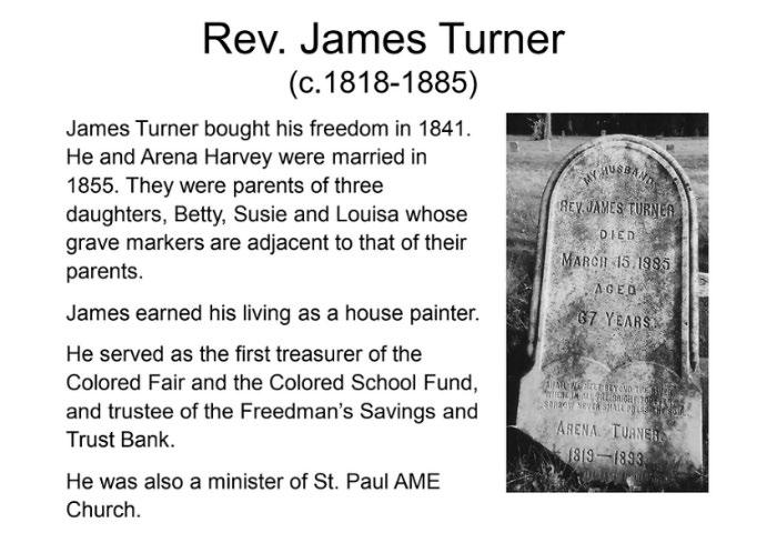 Reverend James Turner (1818-1885) purchased his freedom in 1842 and married Arena Harvey in 1855. They had three (3) daughters named Susie, Betty, and Louisa. They all are buried in the Lexington African Cemetery #2. Reverend Turner pastored several AME churches along with serving HSPAME when he was enslaved and after his emancipation.