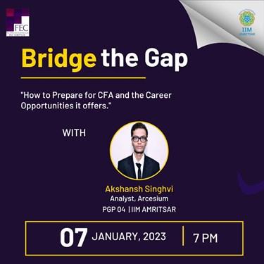 Bridge the Gap: Bridge the Gap is an interactive discussion series conducted by FEC. It aims to connect students with our alums and other industry stalwarts through sessions and discussions on various relevant financial topics. FEC conducted the most recent "Bridge The Gap" session in January 2023, which had the topic - "How to prepare for CFA and the career opportunities it offers."