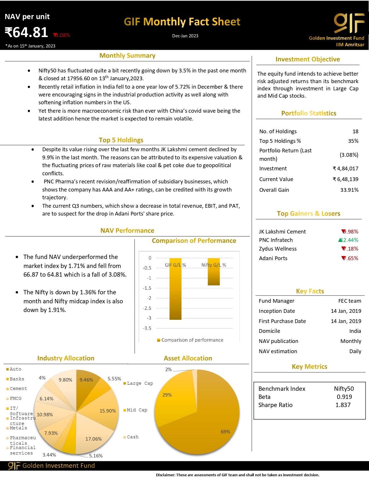 The Finance and Economics Club, IIM Amritsar announced the launch of Golden Investment Fund (GIF), the student-run investment fund of IIM Amritsar, in February 2019. It was started with the aim to give hands-on experience to the students about investing and applying their research into the equity markets. Team GIF aims to create a culture of research, analysis, and investment among the members of FEC and Finance Enthusiasts of IIM Amritsar. The equity fund intends to achieve better riskadjusted returns than its benchmark index through investment in large-cap, mid-cap, and small-cap stocks.