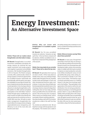 Rinkita: Please tell our readers about EnergyFunders and what makes it unique. Mr Racusin: EnergyFunders is an online investment marketplace disrupting the energy industry by evolving the way capital investment and energy projects come together to generate more profitable commerce. We founded EnergyFunders in 2013 in Houston. The fintech company currently offers professionally vetted oil and gas projects as financial opportunities for accredited investors nationwide and internationally, with the goal to soon opens the marketplace to every type of investor. Our team of experienced securities attorneys and trusted specialists in the oil and gas industry allowed us to develop EnergyFunders as the first platform to offer national and global participation in the $263 billion “small oil” market through equity crowdfunding. As a result, investors are able to buy directly into wells and reservoirs for minimums as low as $5,000. With more than 100 wells as assets under management, EnergyFunders has raised millions for energy ventures, bringing unprecedented access, transparency, and efficiency to one of the most elite and lucrative asset classe