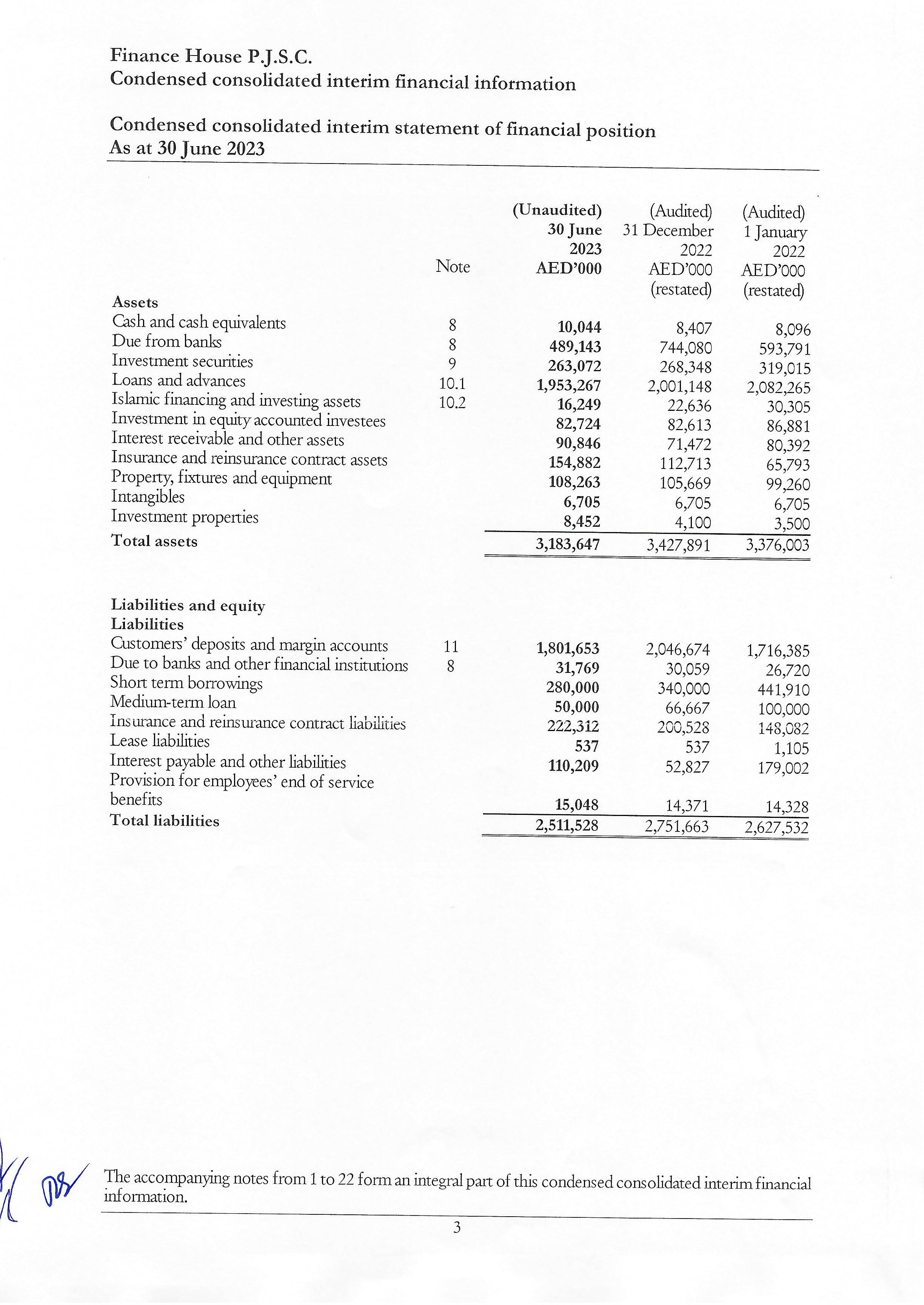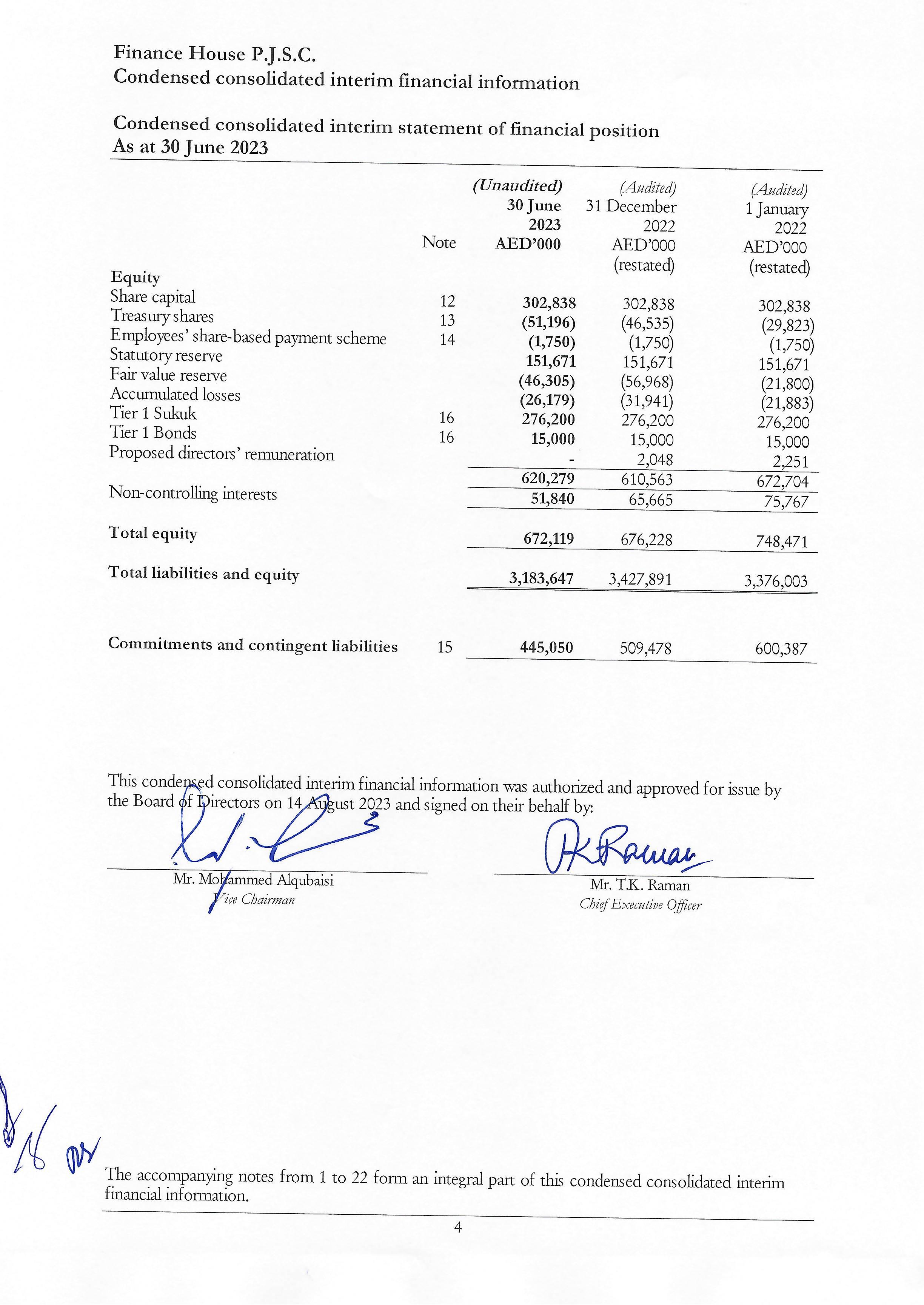 We have reviewed the accompanying condensed consolidated statement of financial position of Finance House P.J.S.C. (the “Company”) and its subsidiaries (together the “Group”) as at 30 June 2023 and the related condensed consolidated interim statement of comprehensive income, condensed consolidated interim statement of changes in equity and condensed consolidated interim statement of cash flows for the six-month period then ended, and other explanatory notes. Management is responsible for the preparation and fair presentation of this condensed consolidated interim financial information in accordance with International Accounting Standard 34 Interim Financial Reporting (“IAS 34”) as issued by the International Accounting Standard Board (IASB). Our responsibility is to express a conclusion on the condensed interim consolidated financial information based on our review.