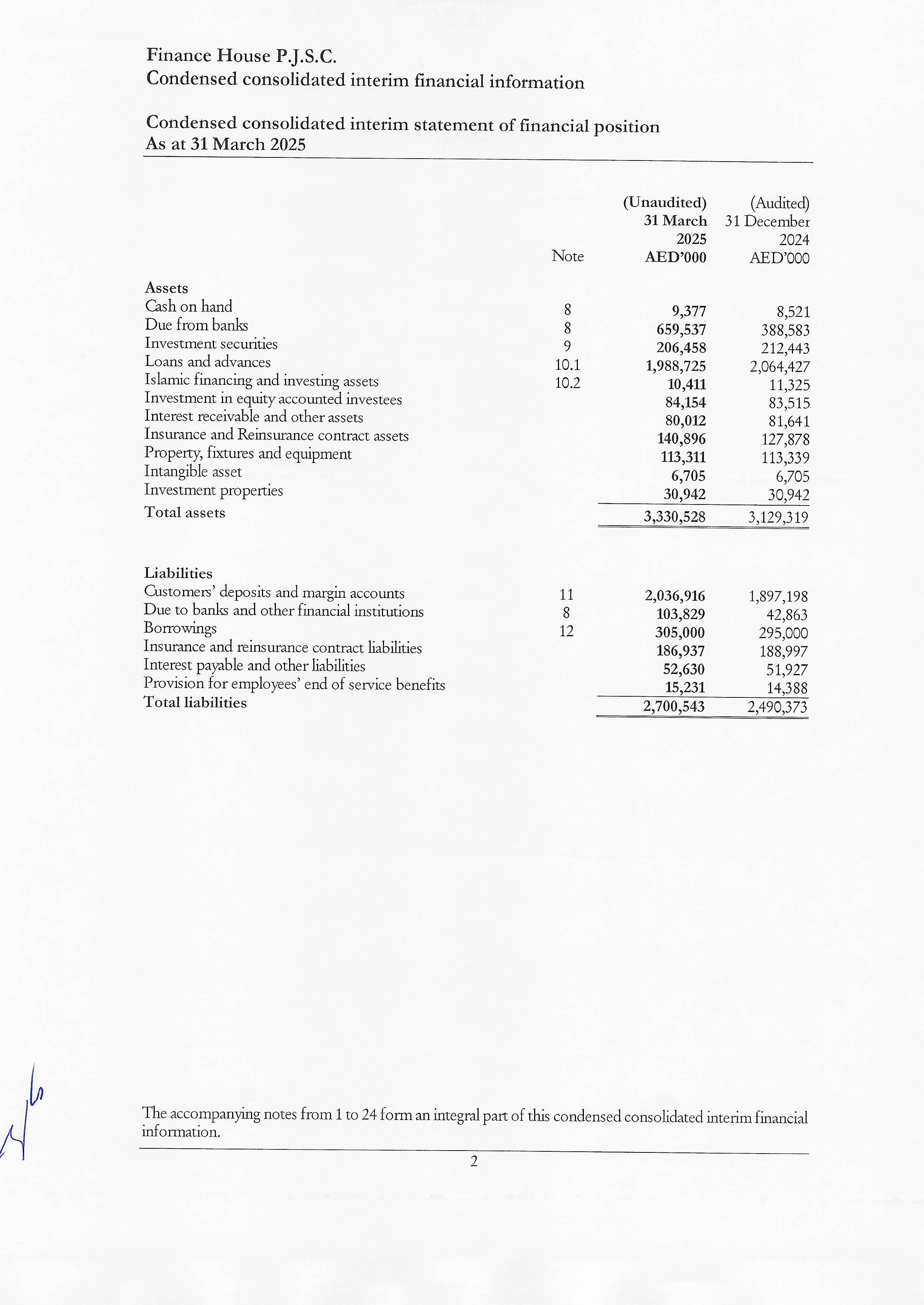 WehavereviewedtheaccompanyingcondensedconsolidatedinterimstatementoffinancialpositionofFinance HouseP.J.S.C.(the“Company”)anditssubsidiaries(togetherthe“Group”)asat31March2025andtherelated condensedconsolidatedinterimstatementsofprofitandloss,andothercomprehensiveincome,changesinequity andcashflowsforthethree-monthperiodthenendedandotherexplanatorynotes.Managementisresponsiblefor thepreparationandfairpresentationofthiscondensedconsolidatedinterimfinancialinformationinaccordancewith theInternationalAccountingStandard34InterimFinancialReporting(“IAS34”)asissuedbytheInternational AccountingStandardBoard(IASB).Ourresponsibilityistoexpressaconclusiononthecondensedinterim consolidatedfinancialinformationbasedonourreview.
