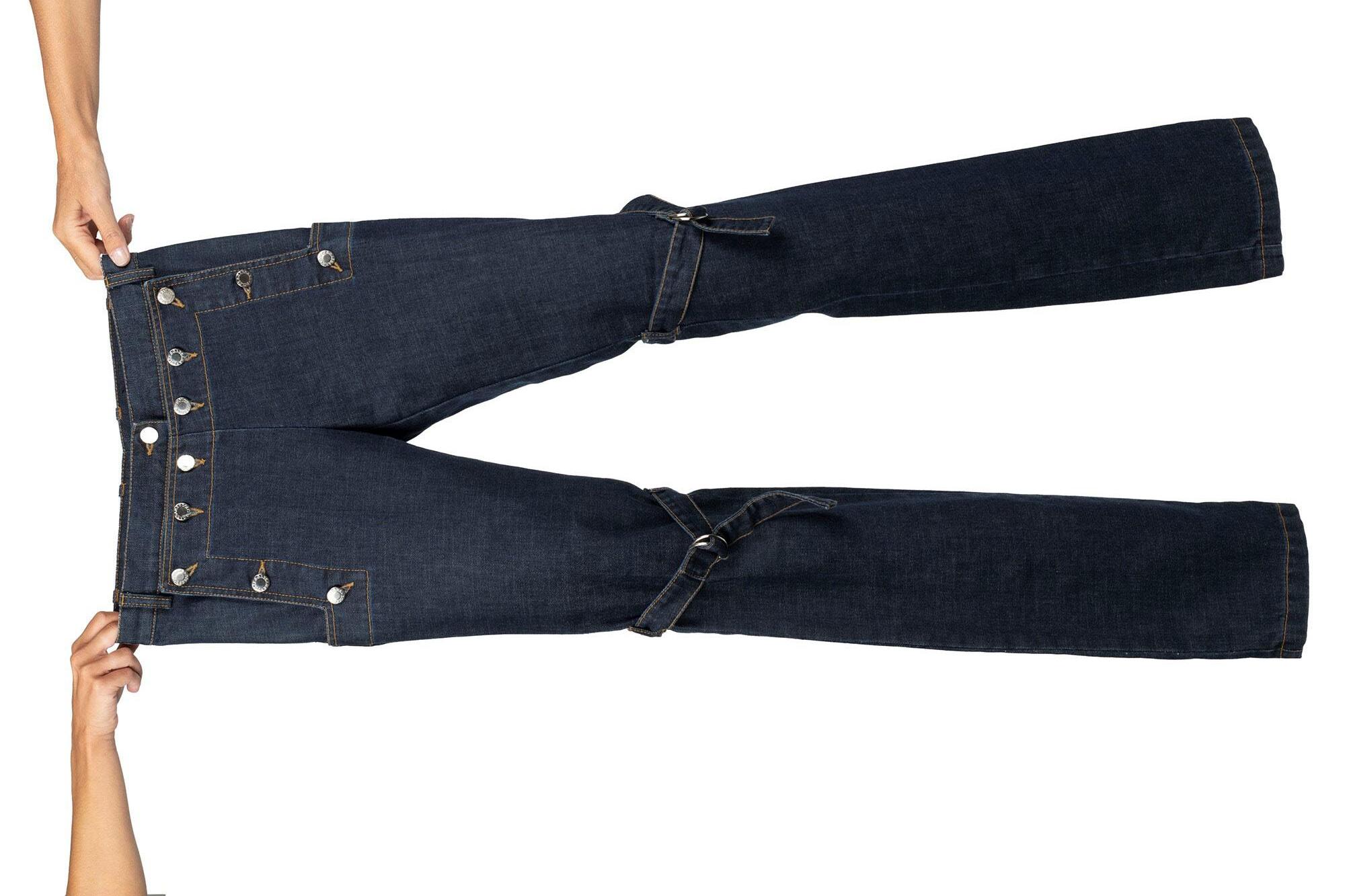 JEANS color blu scuro, bottini in metallo, tg 42 italiana, Collezione primavera Runway 2003 Mid-rise cotton denim blue jeans, with multisilver metal logo buttons and metal hardware, italian size 42, Collezione primavera Runway 2003