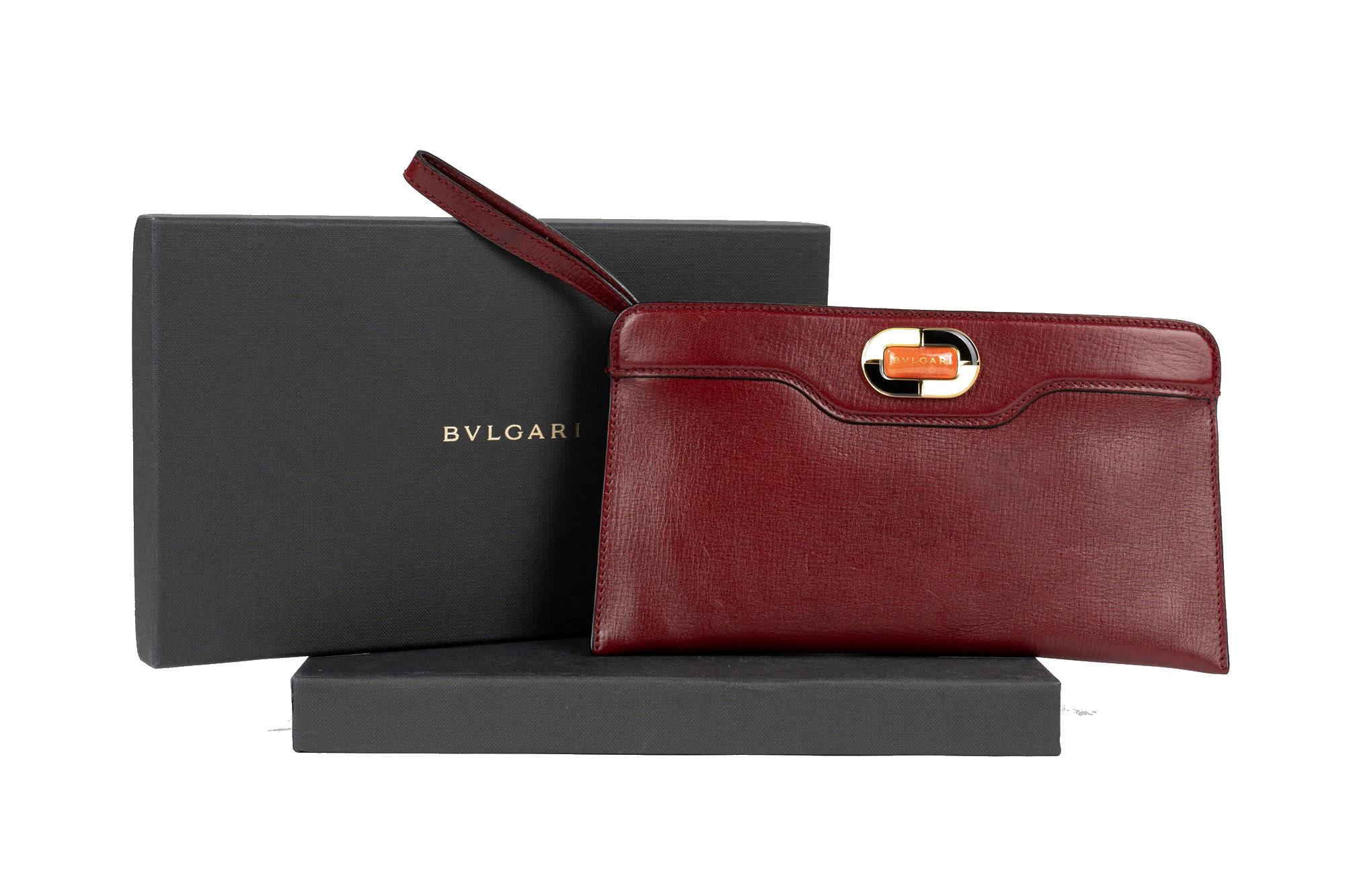 POCHETTE in pelle color bordeaux, con placchetta policroma e chiusura a cerniera, cm 21 x 11,5 (difetti)