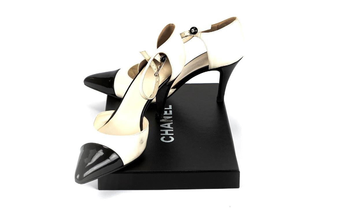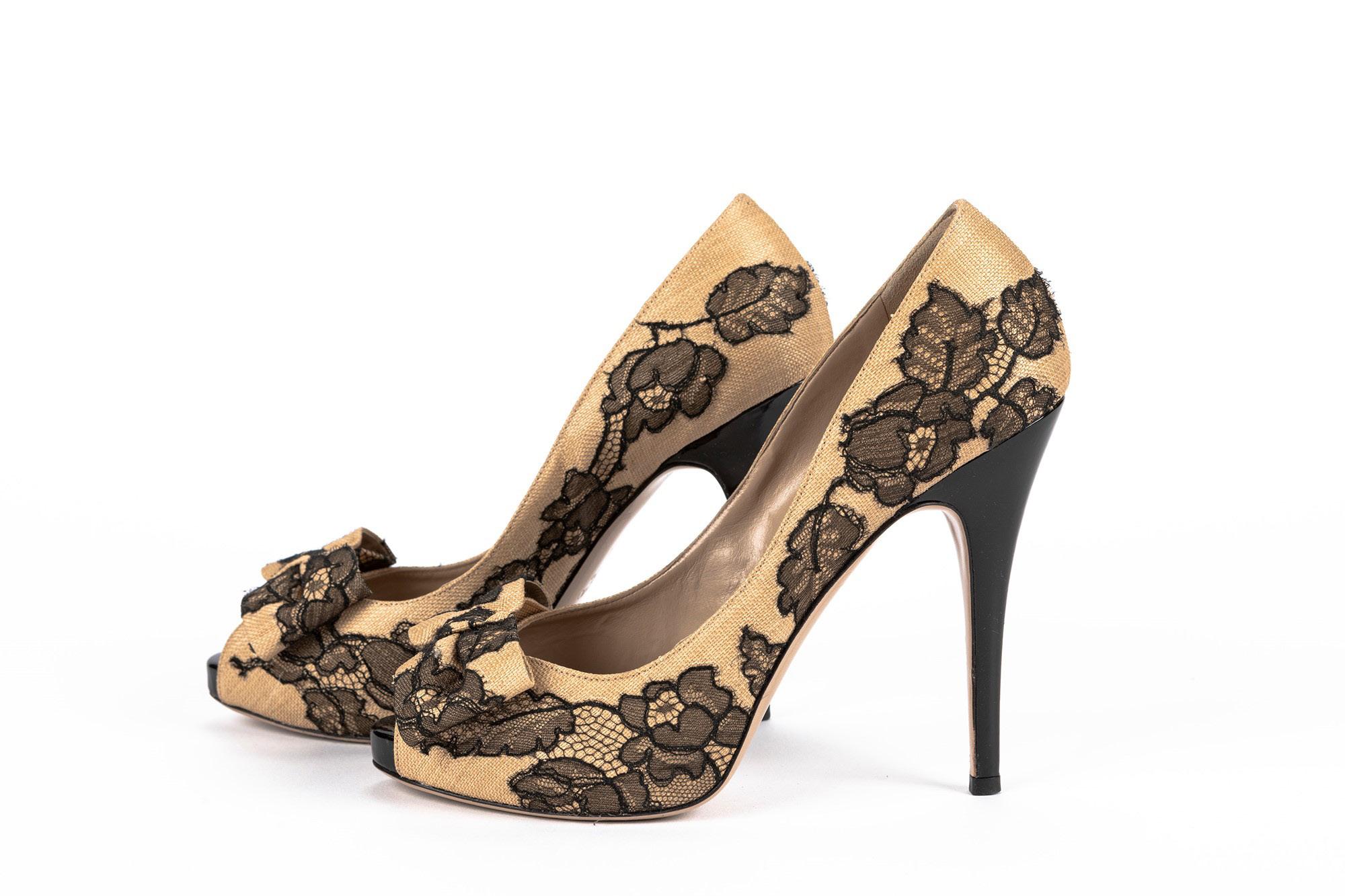 Beige fabric and black lace open toe with ribbon décolleté, heel 12,5, size 40 (slight defects)
