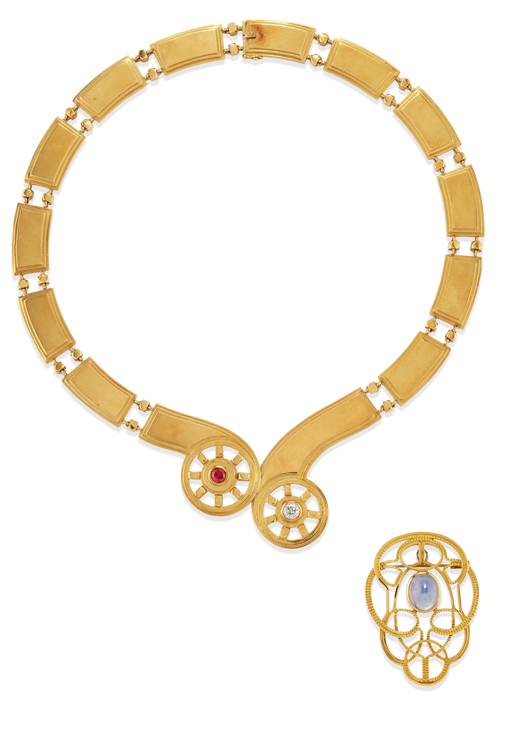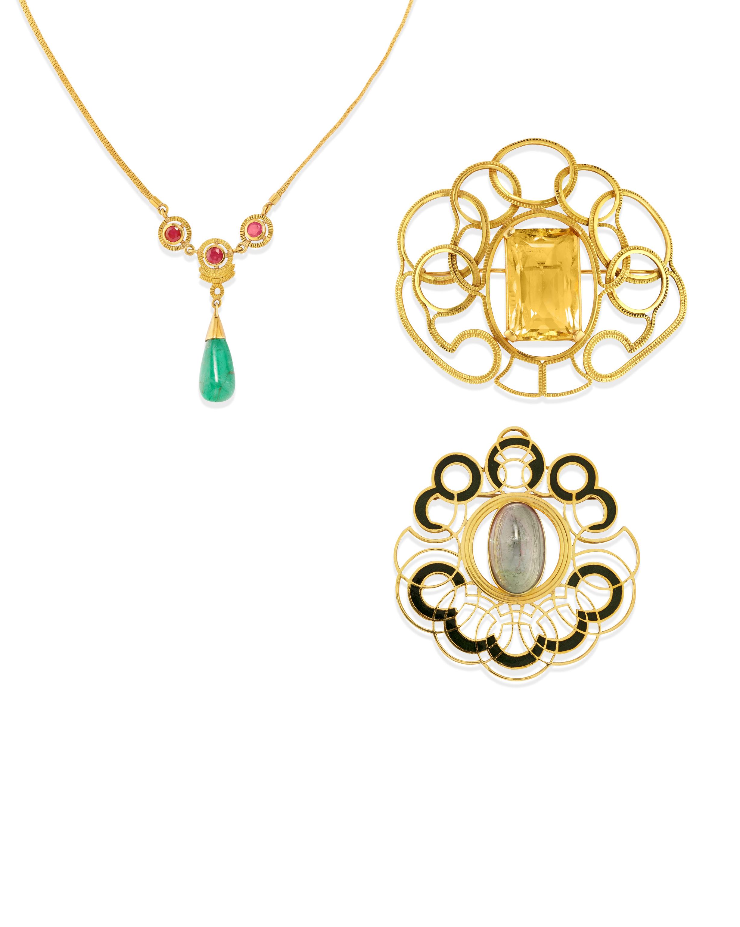 BROOCH WITH COLOURED STONES, 18k yellow gold, with circle motifs and hammered gold decoration, in the centre large emerald-cut yellow quartz, defects (one claw broken).