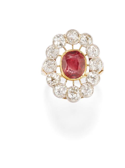 COLLANA CON RUBINO E DIAMANTE, in oro giallo 18k, maglia piatta, con terminali centrali a ruota, rubino taglio rotondo e diamante taglio brillante.