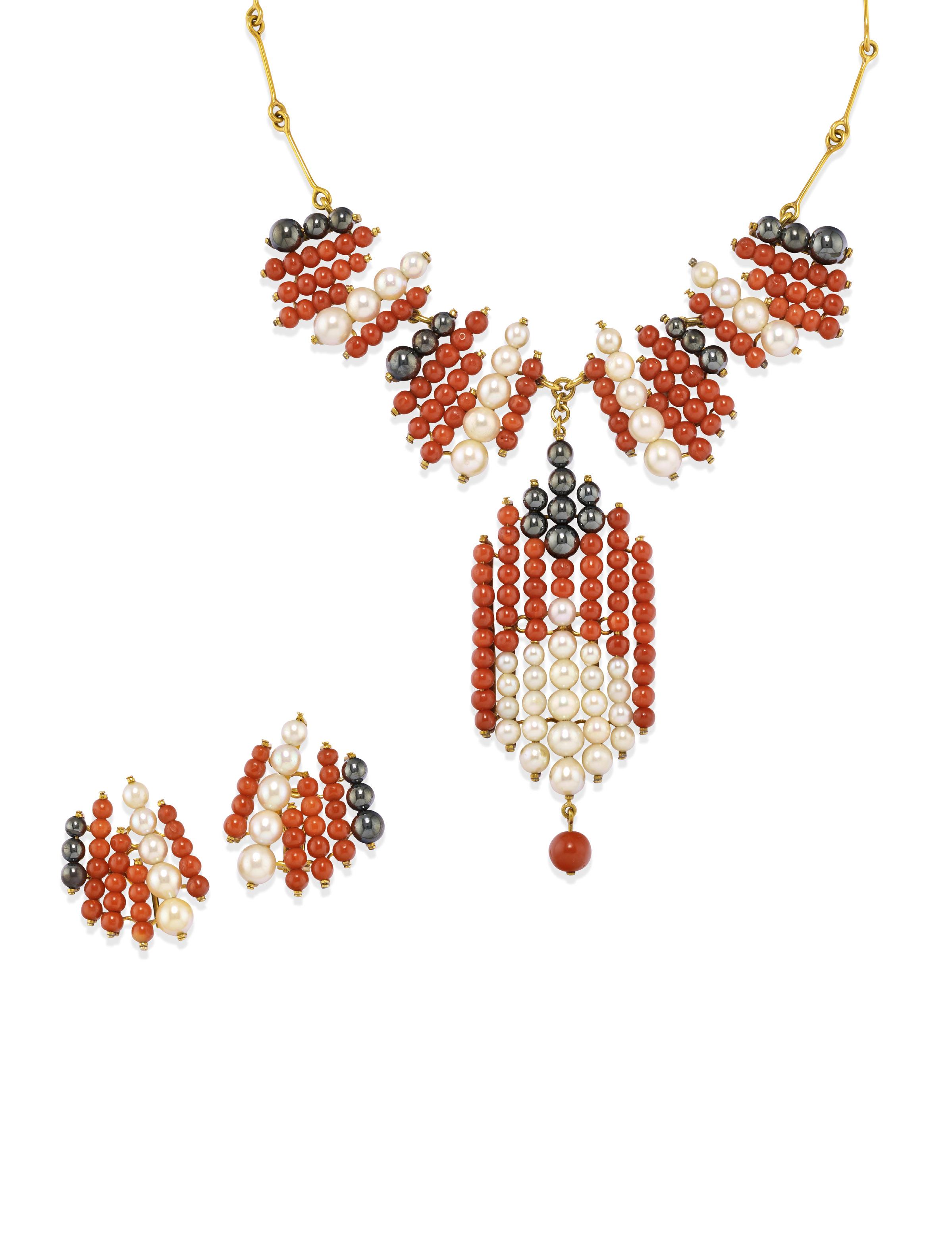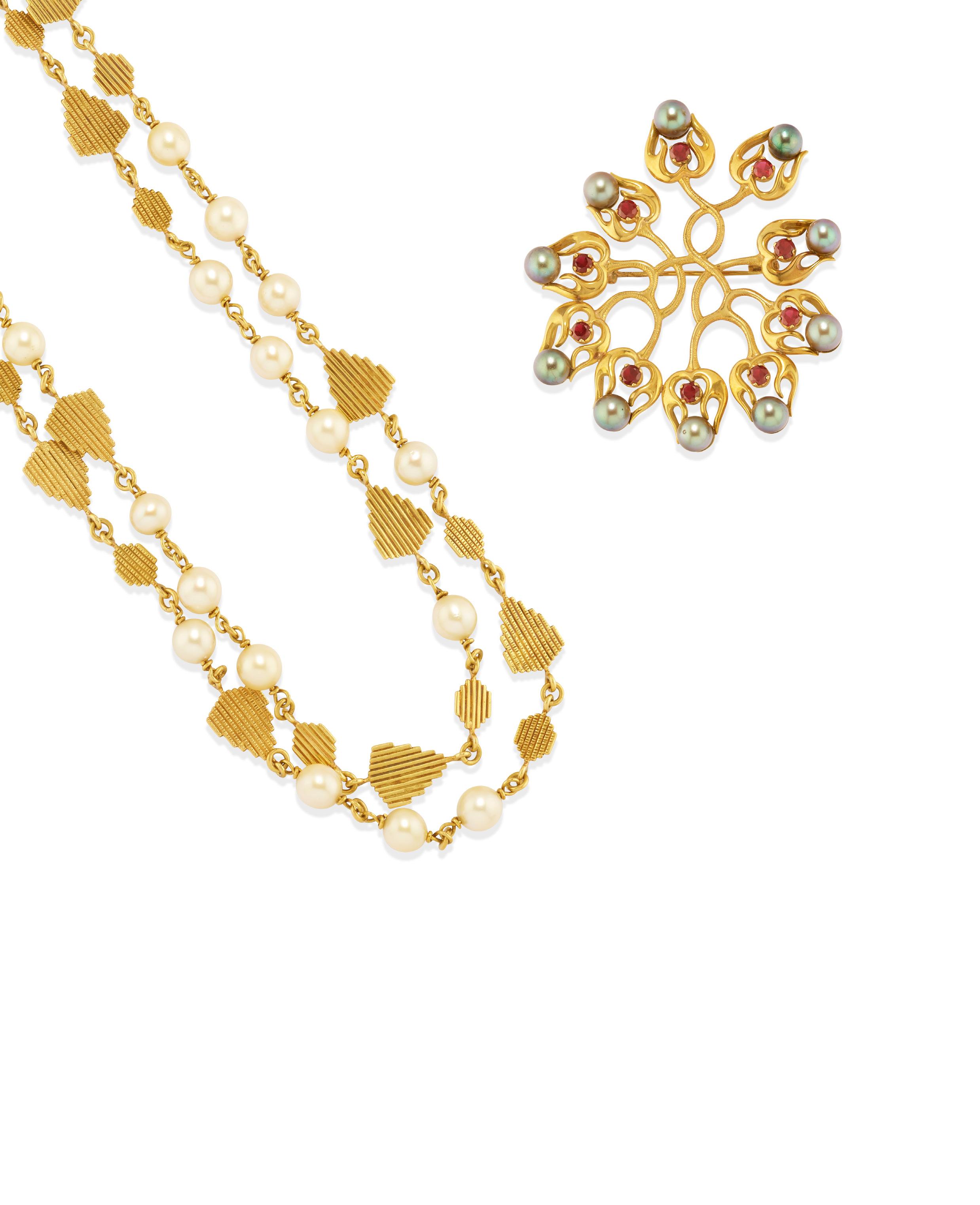 SPILLA CON PIETRE DI COLORE, in oro giallo 18k, di forma stilizzata, perle coltivate Tahiti e pietre rosse taglio rotondo (prob. granati).