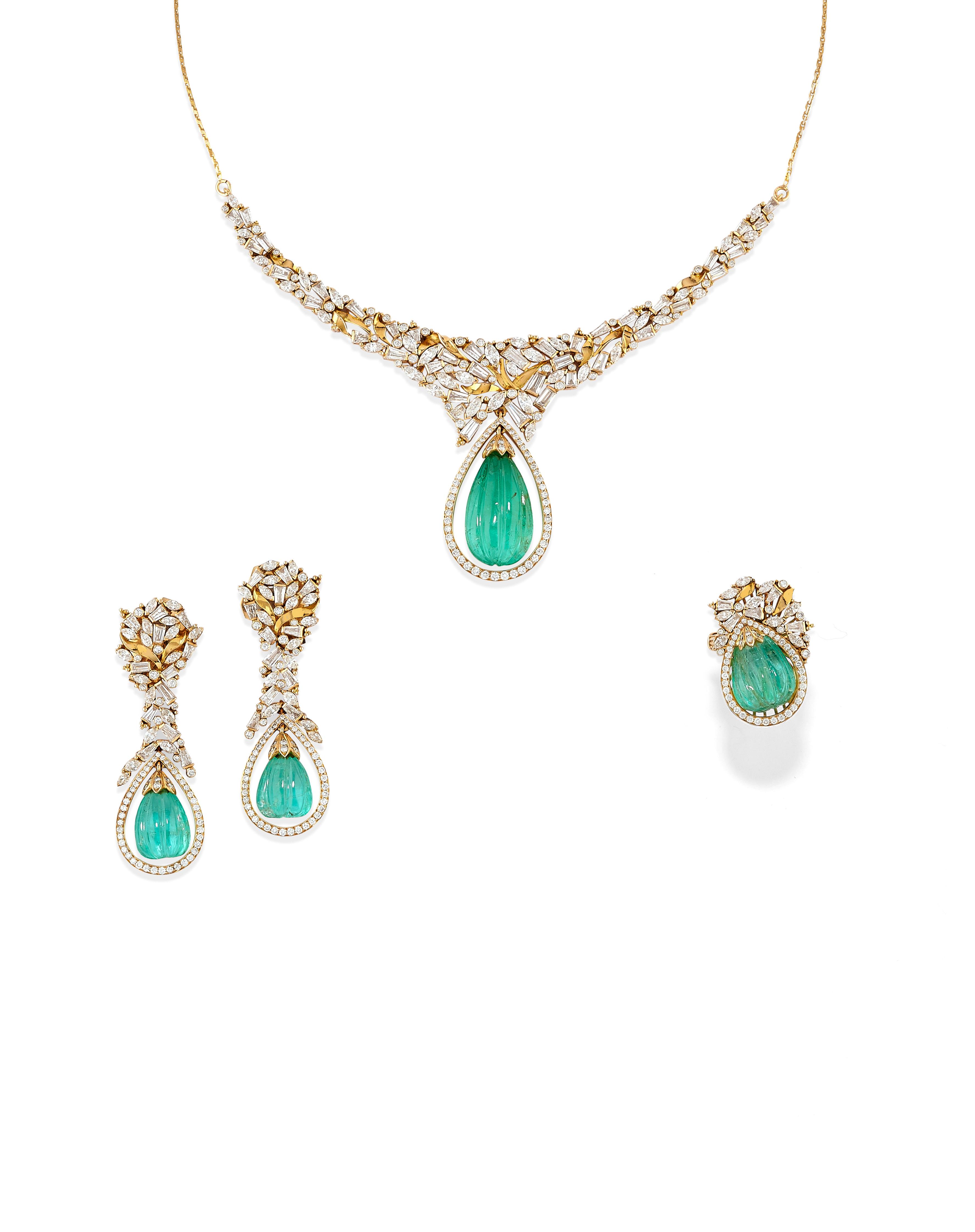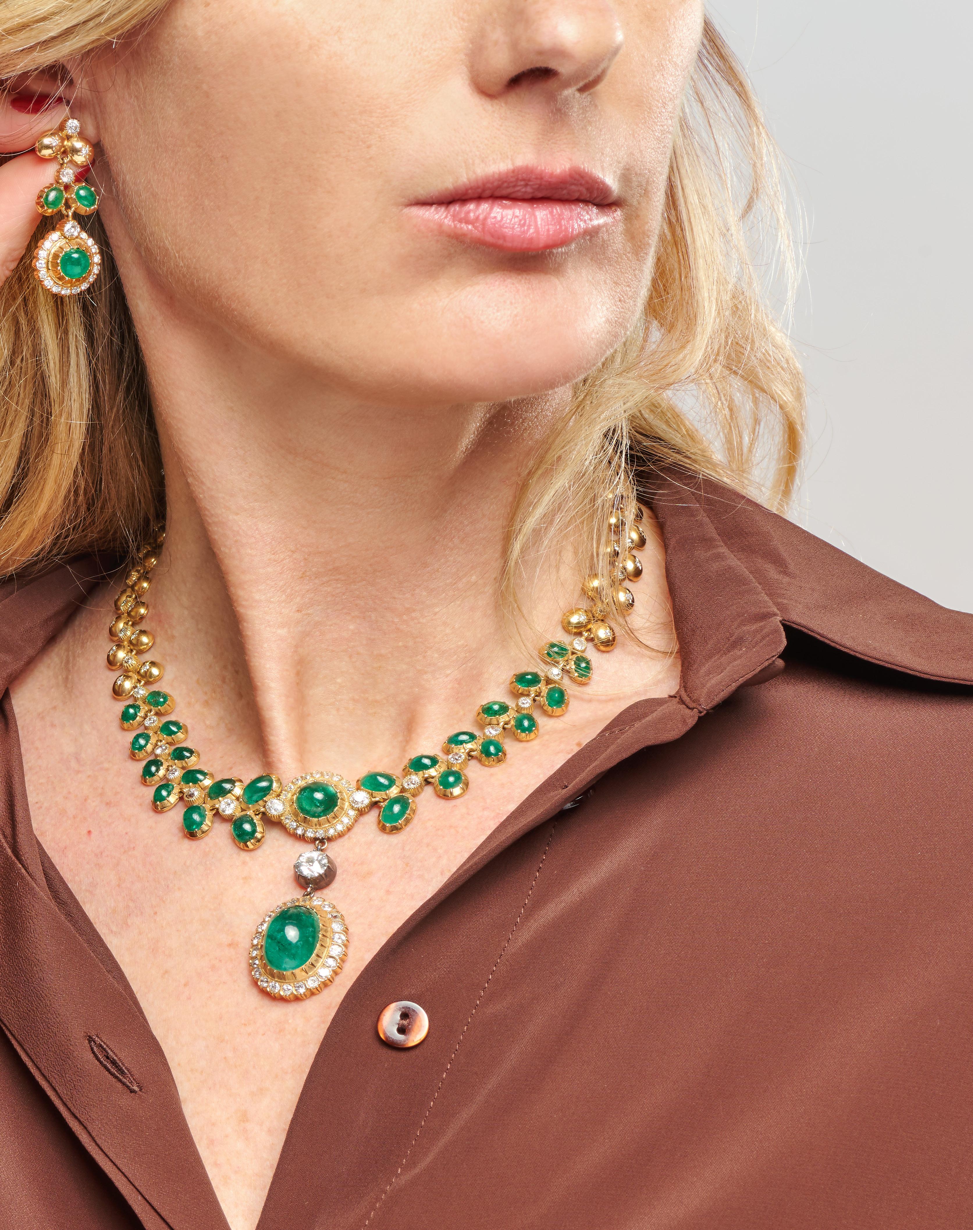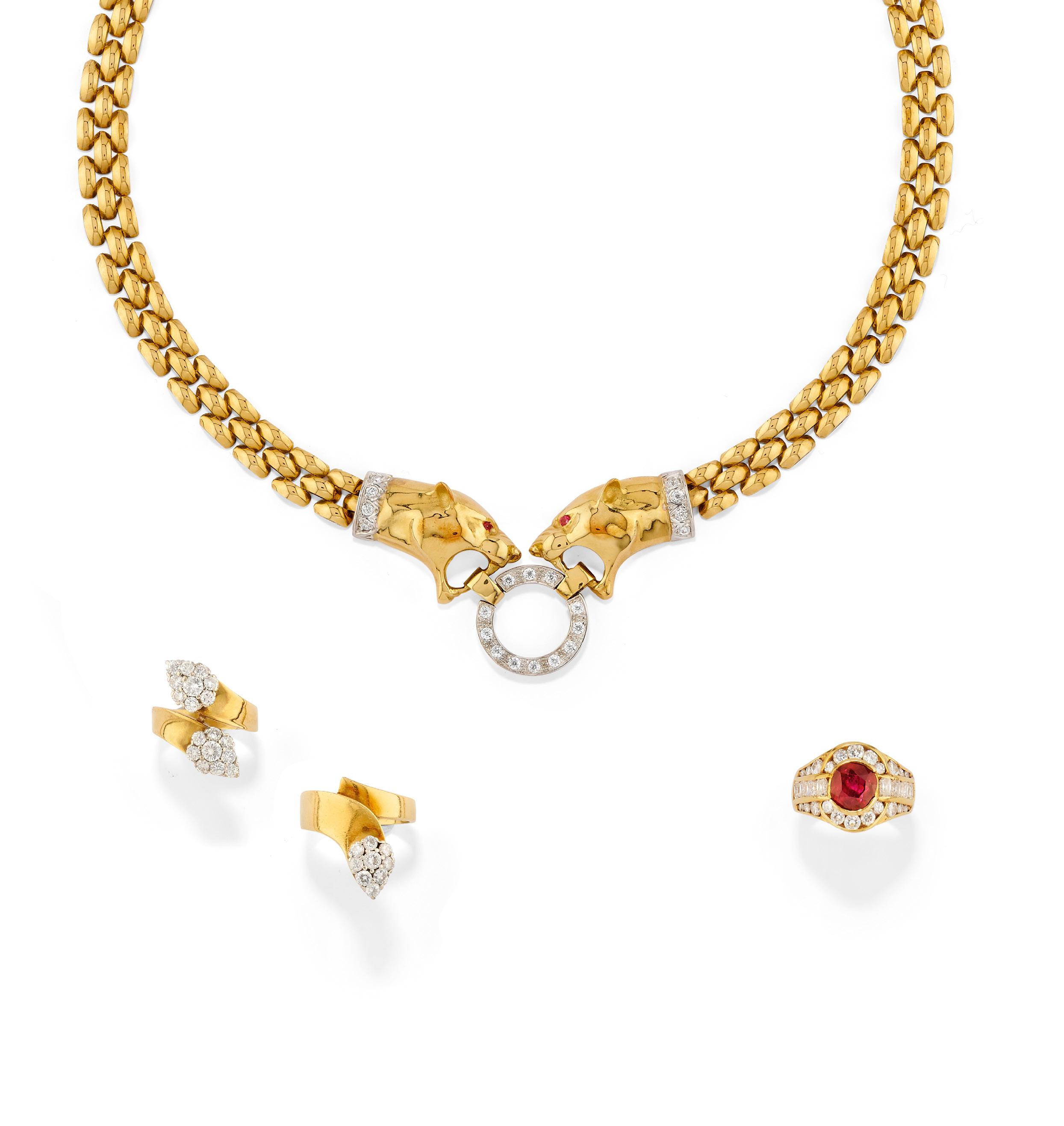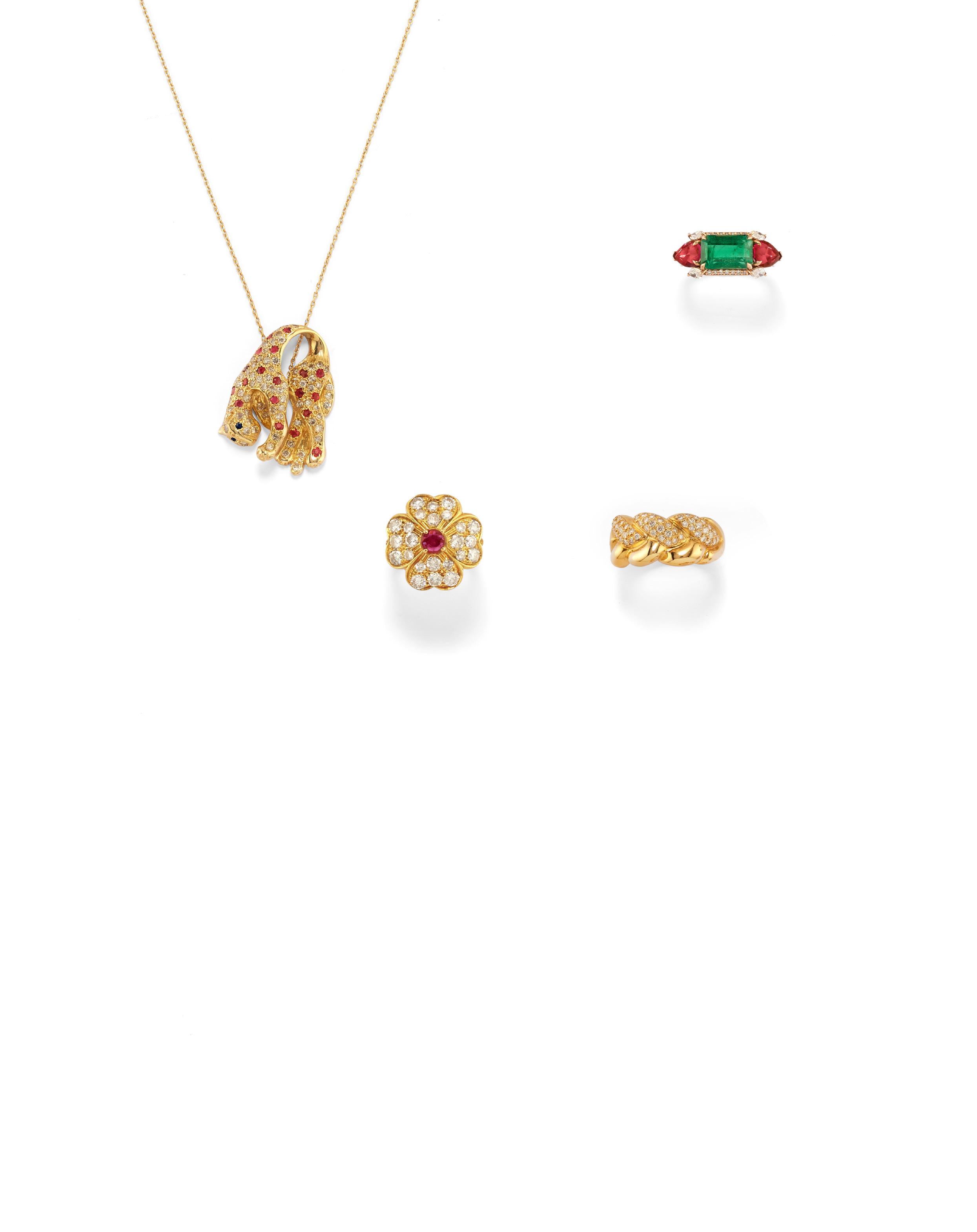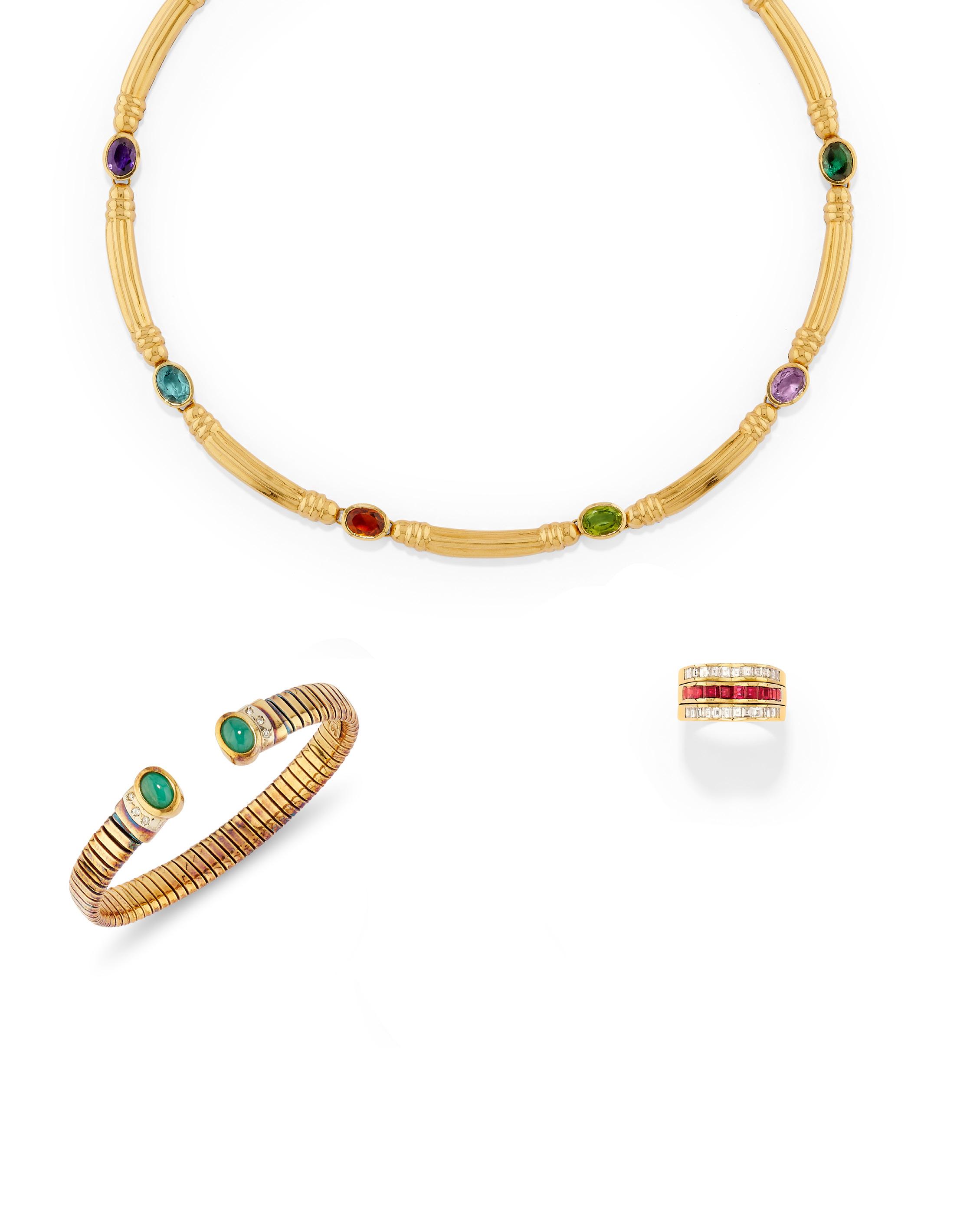 RUBY AND EMERALD NECKLACE, 18k yellow gold, woven link, three round-cut rubies at the centre, hammered gold decoration, pear-cut emerald pendant.