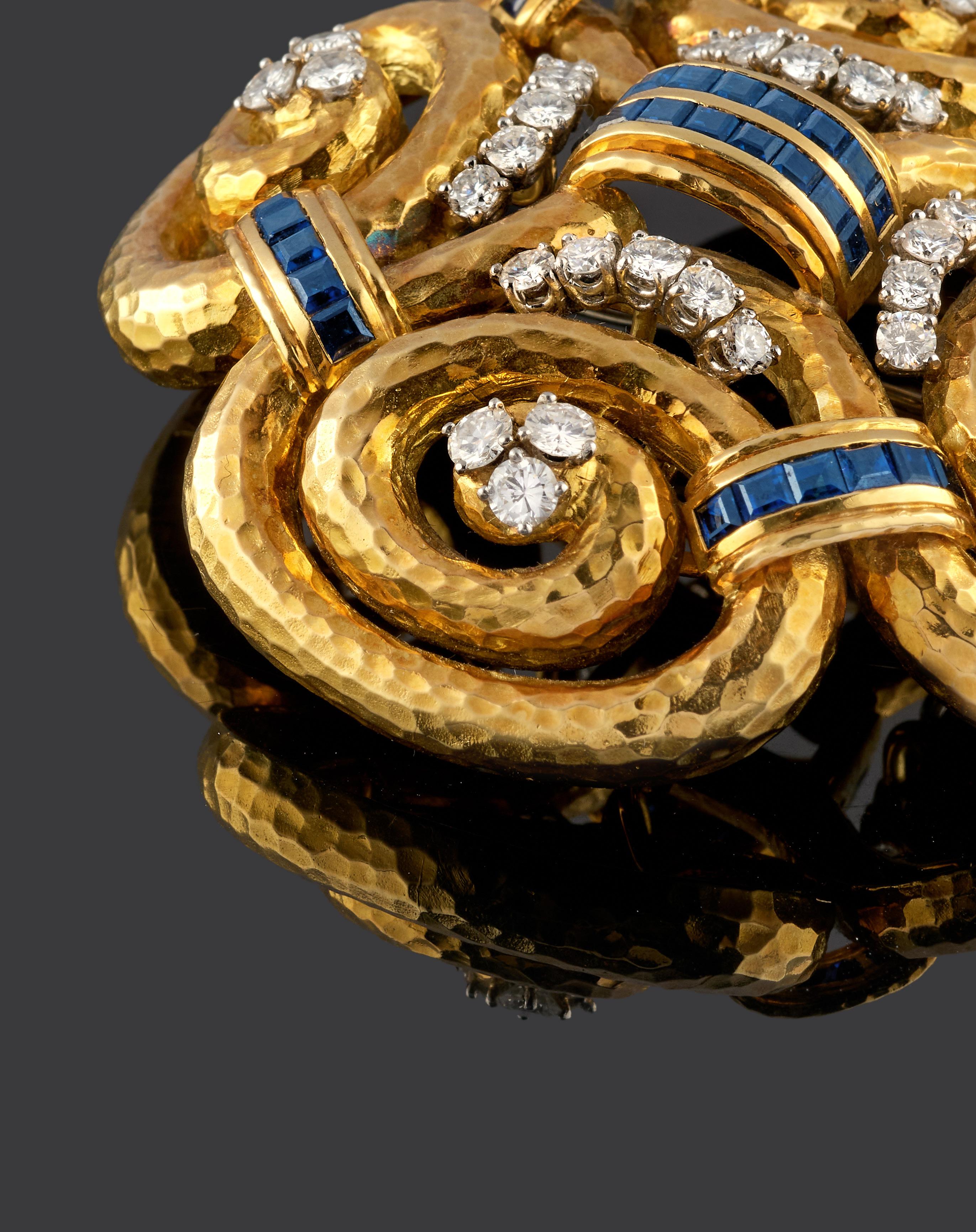 BROOCH PENDANT WITH COLOURED STONE, with hammered gold decoration, oval-cut blue stone (prob. sapphire) cabochon in the centre.