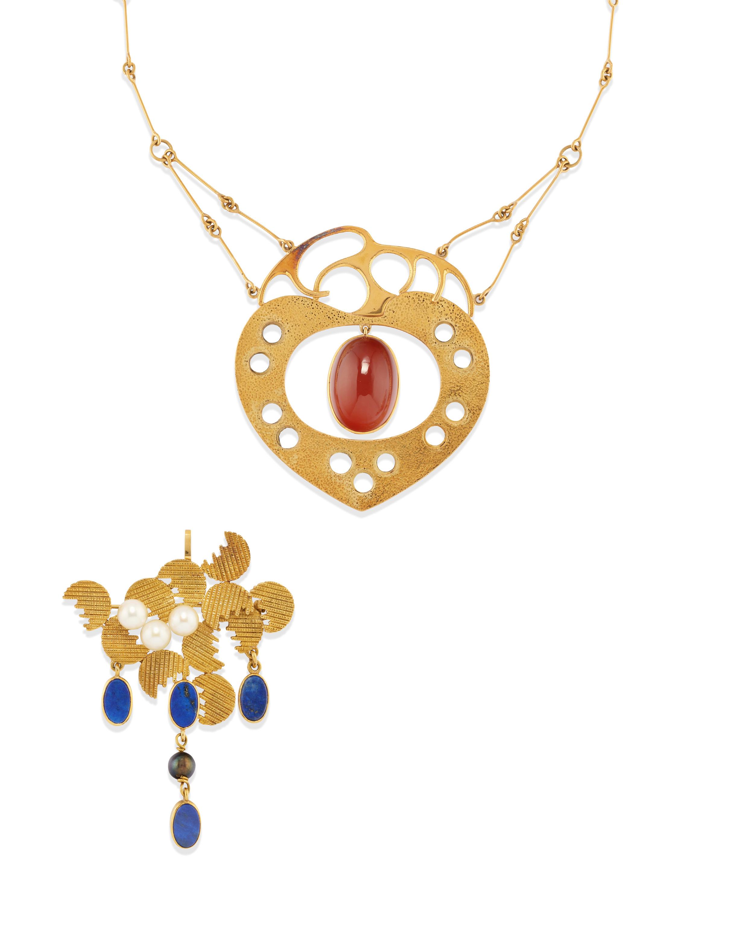 BROOCH PENDANT WITH COLOURED STONES, 18k yellow gold, stylised shape, with hammered gold decoration, lapis lazuli and cultured pearls.