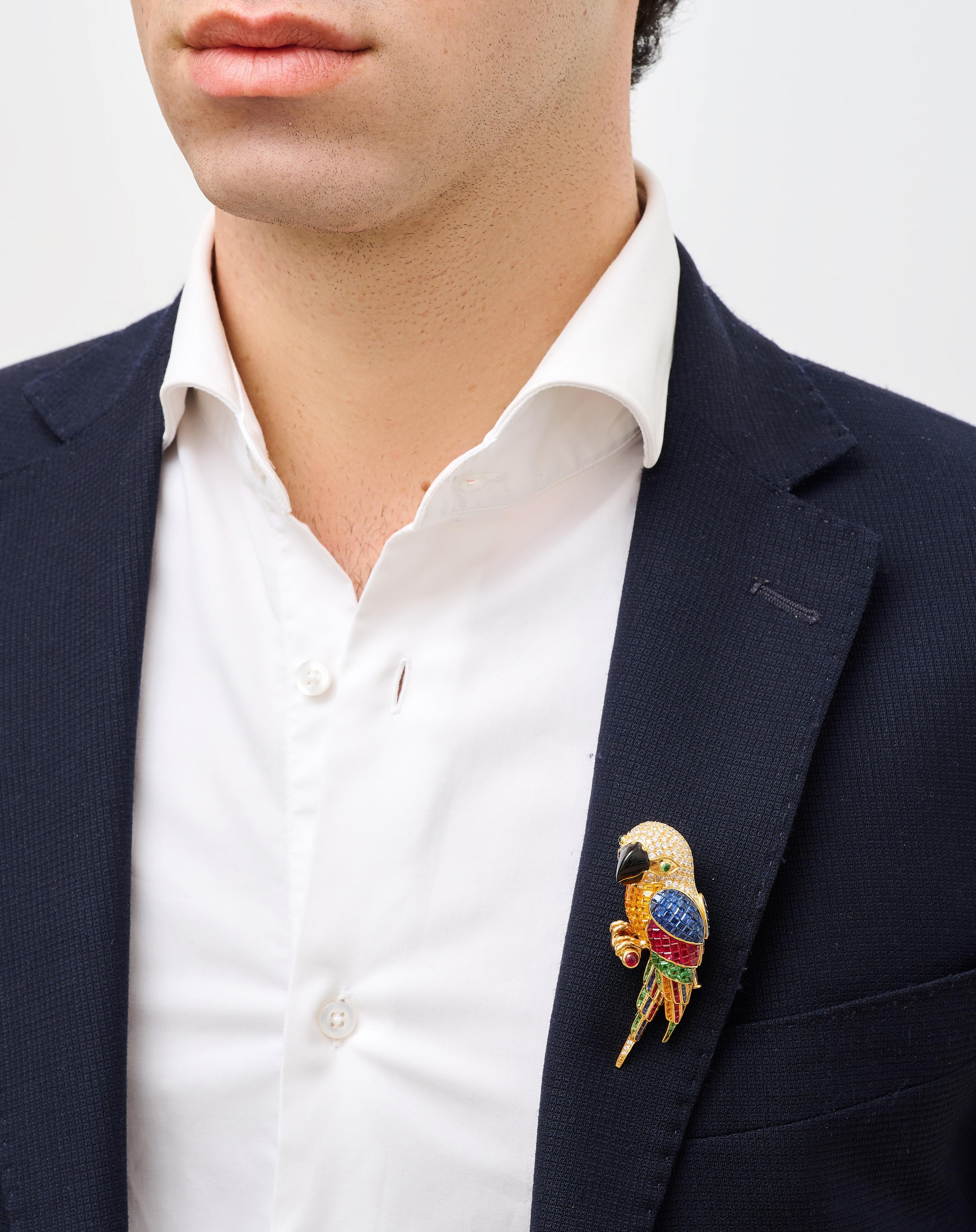 SPILLA CON PIETRE DI COLORE, in oro giallo 18k, di forma stilizzata, con pietre verdi taglio rotondo (prob. peridoti) e pietre rosse taglio rotondo e ovale cabochon (prob. granati).