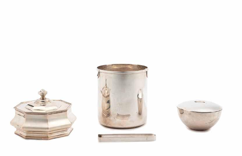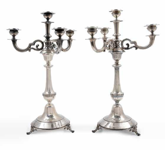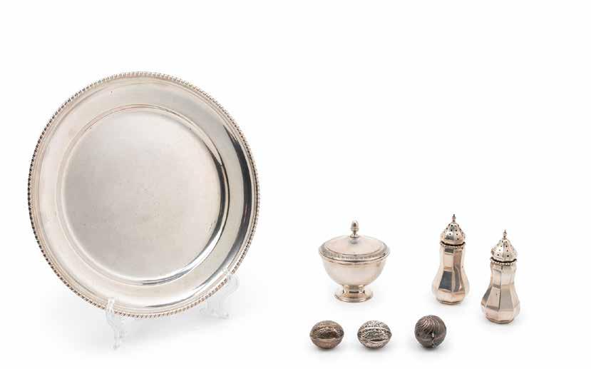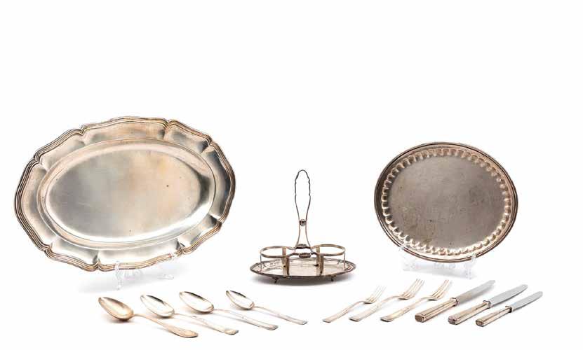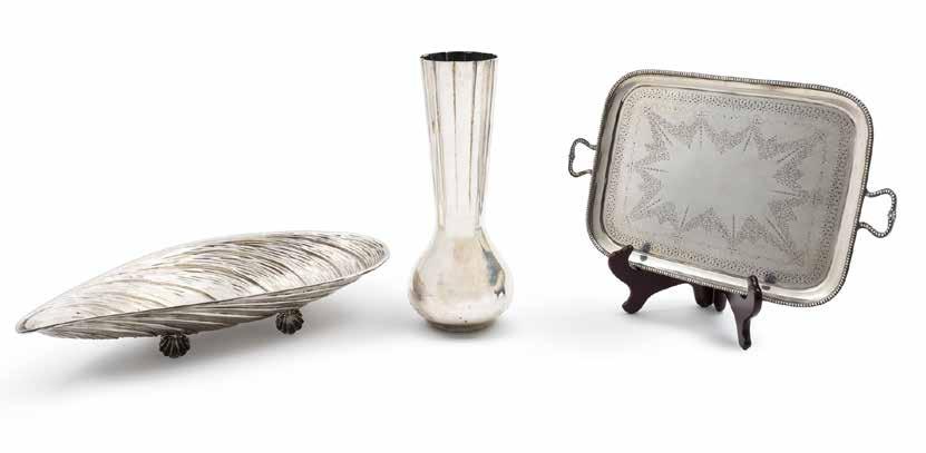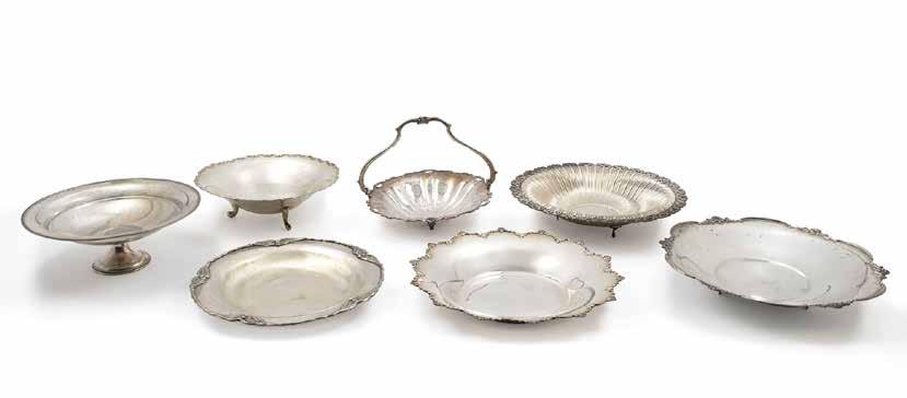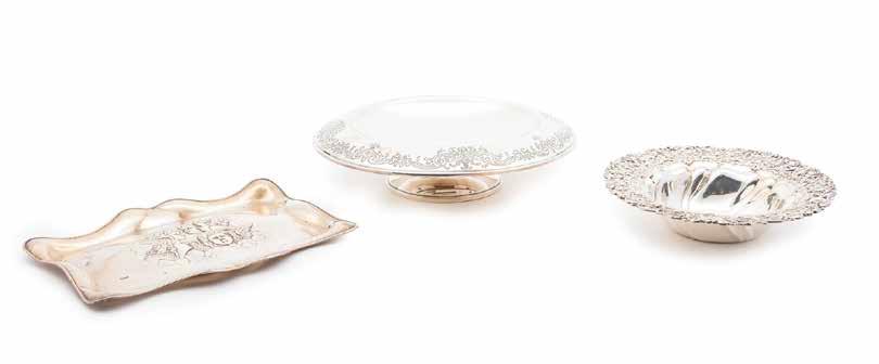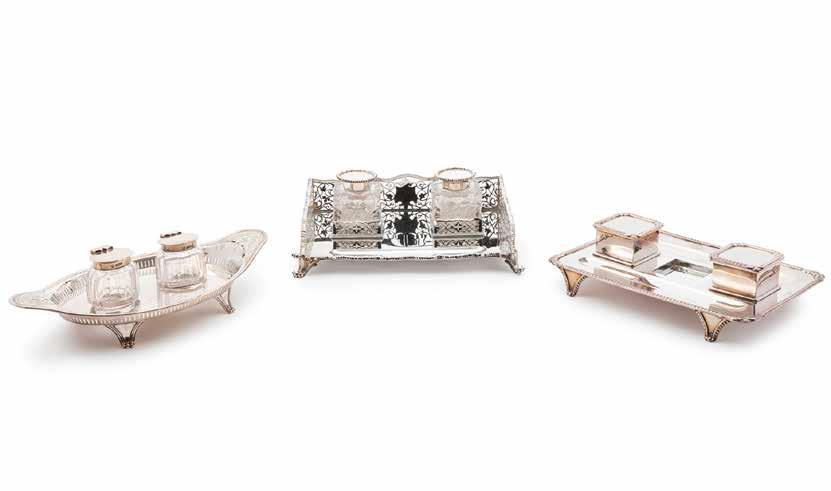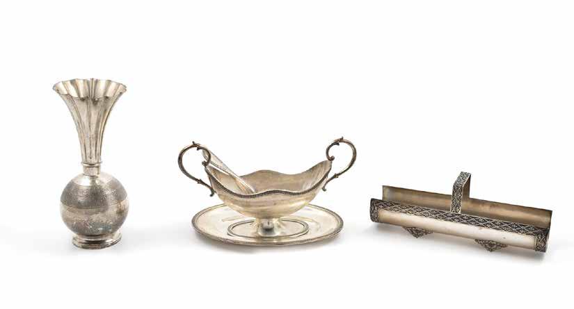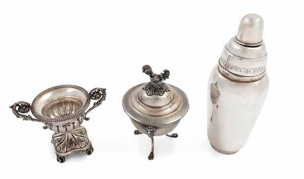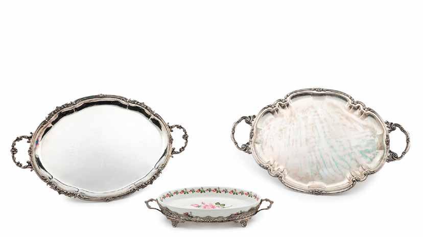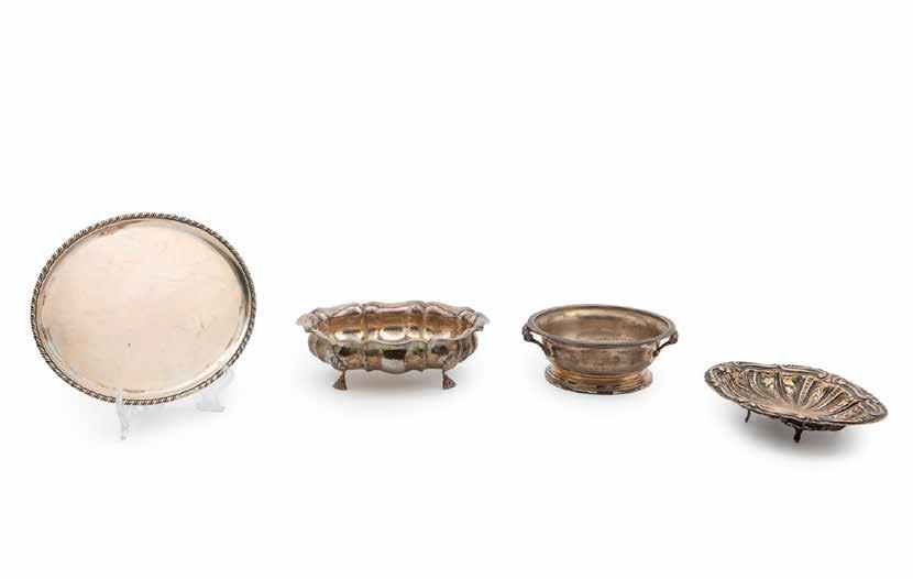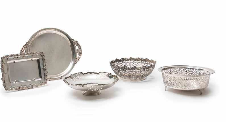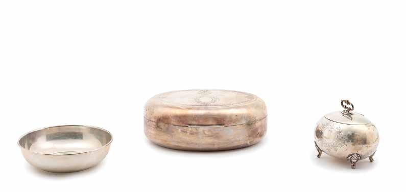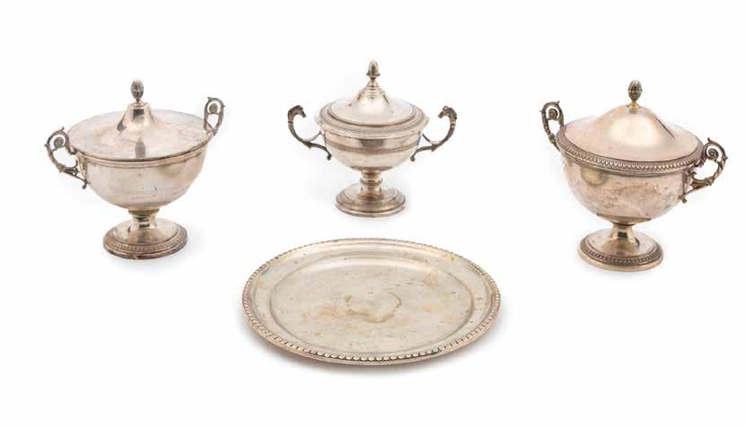 THREE SILVER STANDS, ITALY, 20TH CENTURY, resting on zoomorphic feet, one rectangular with empire-style decoration and two round with openwork border, defects (slight dents). € 450
