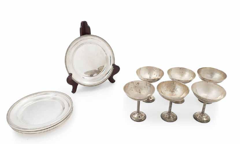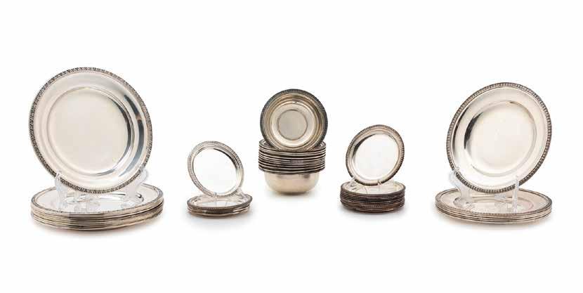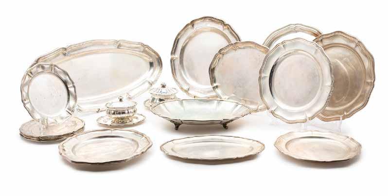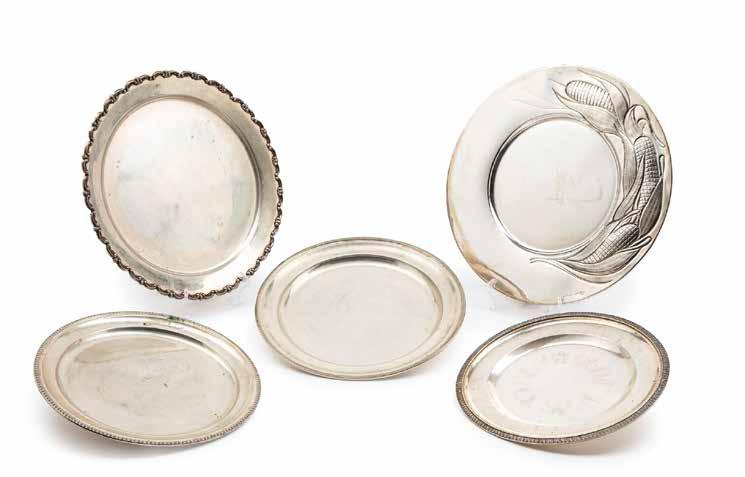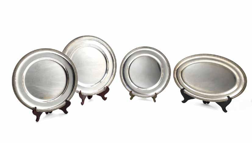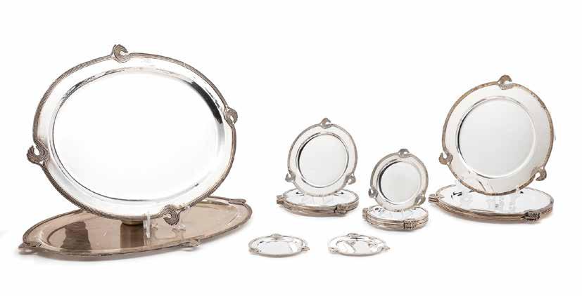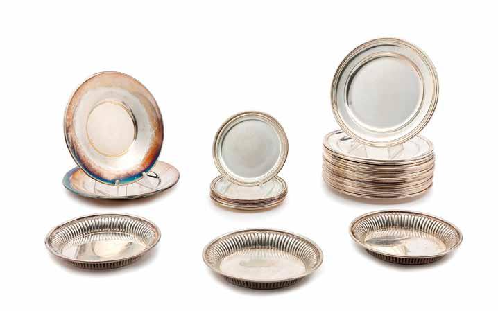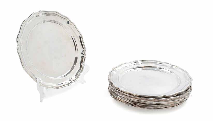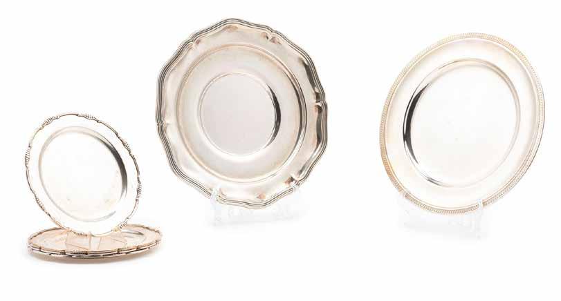 SEI PIATTI, ITALIA, METÀ XX SECOLO, in argento, due piatti e quattro piattini, con bordo a decori diversi.