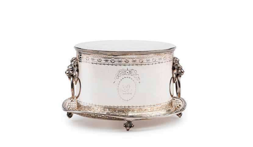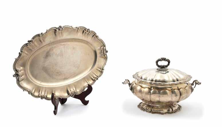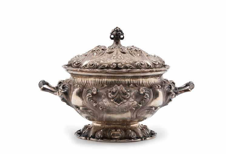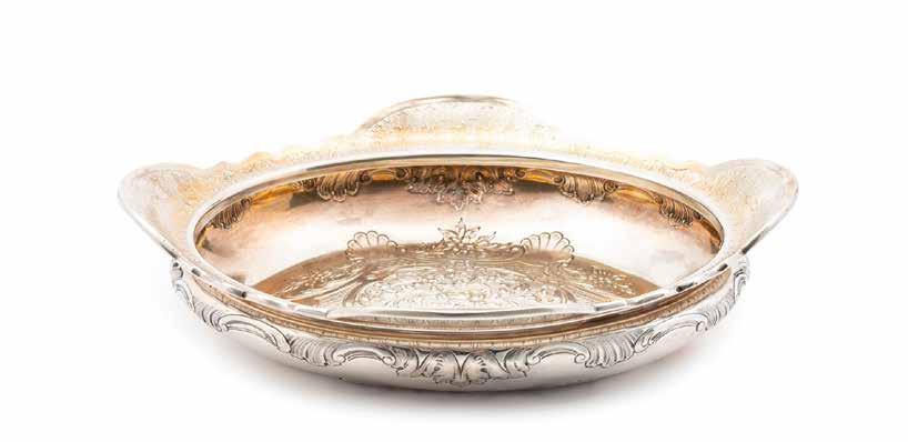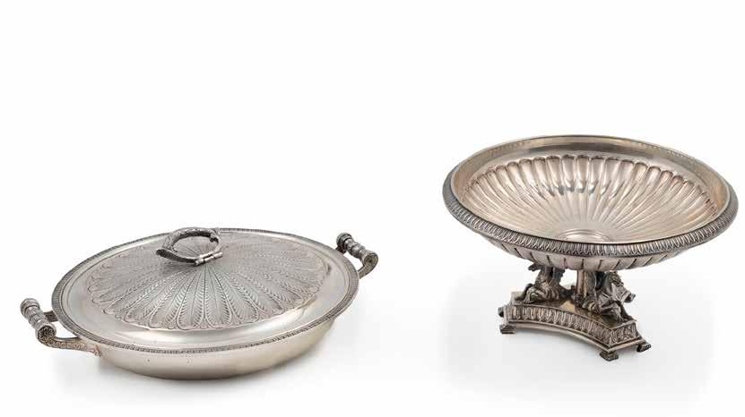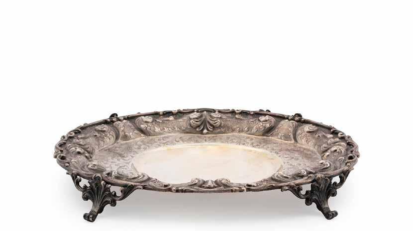 CENTRAVOLA, FIRENZE, XX SECOLO, in argento, di forma ovale, poggiante su quattro piedini a motivo fogliaceo, corpo martellato e prese a forma di drago.