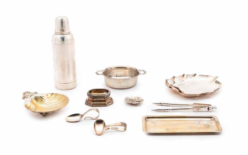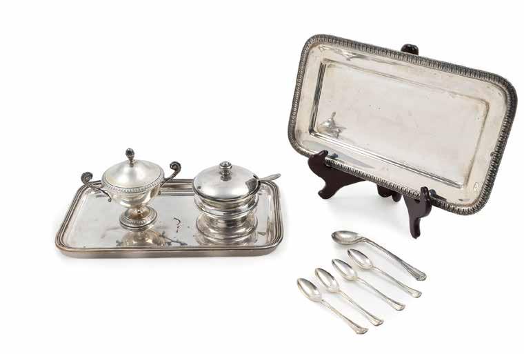 DIECI OGGETTI, ITALIA, XX SECOLO, in argento 800 e 925, composto da due vassoi, una zuccheriera, una formaggiera in argento 925, cinque cucchiaini con differenti decori e un cucchiaino da infante.
