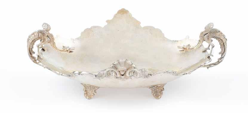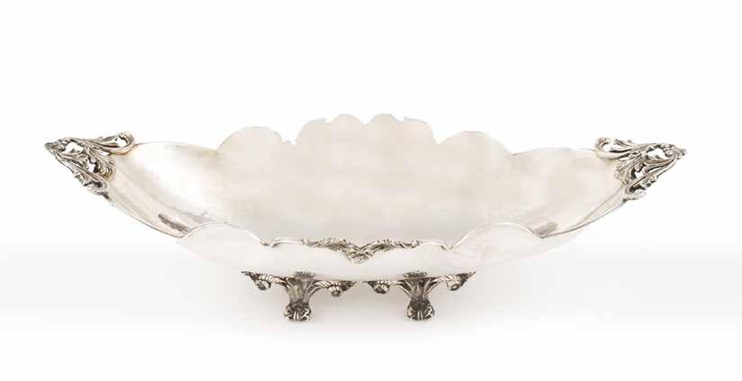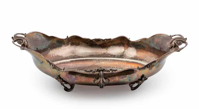 SILVER CENTREPIECE , ITALY, FLORENCE, 20TH CENTURY, oval in shape, resting on four leaf-patterned feet, hammered body, and dragonshaped sockets.