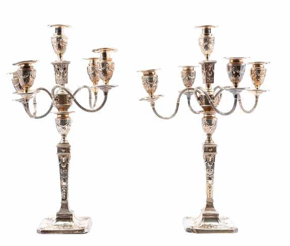 COPPIA DI CANDELABRI, ITALIA, XX SECOLO, in argento, a tre fiamme, base rotonda poggiante su quattro piedini zoomorfi, fusto liscio e decoro in stile Impero.