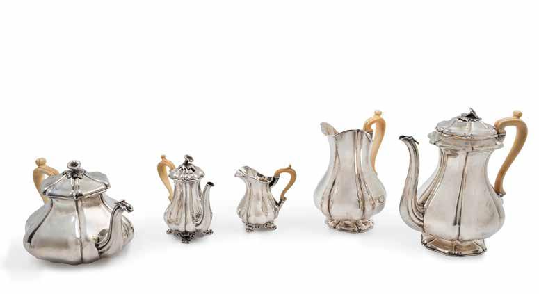 SERVIZIO DA TÈ E CAFFÈ, ALESSANDRIA, XX SECOLO, in argento, composto da caffettiera, teiera, zuccheriera e lattiera con decoro costolato, coperchio con prese a ghianda.