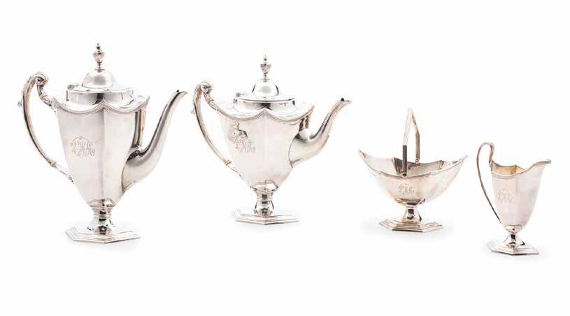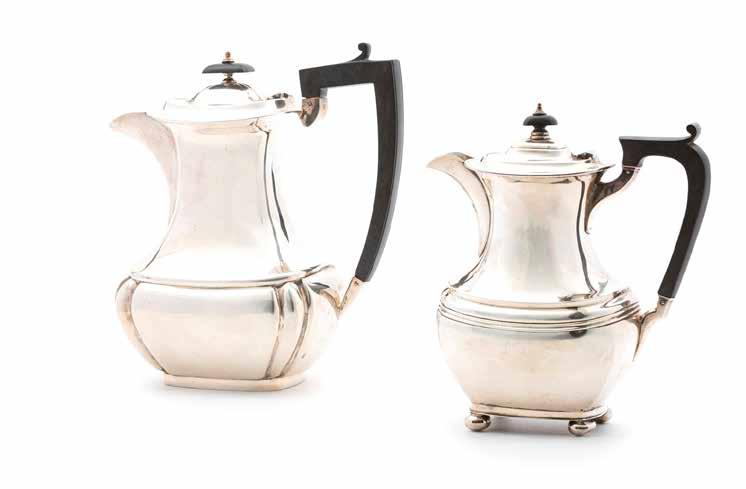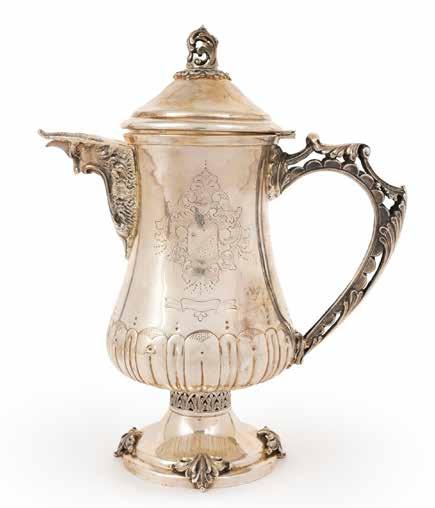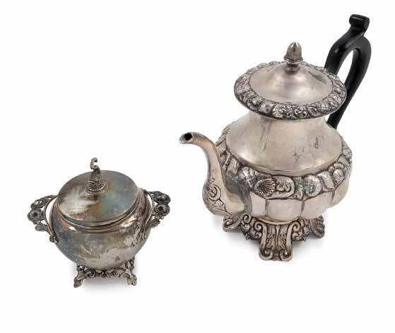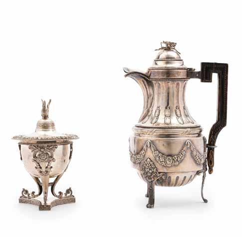 CAFFETTIERA E ZUCCHERIERA, INIZI XX SECOLO, in argento , con ricco decoro in rilievo a ghirlande e fiori, e presa a cigno. Peso kg 1,482 cm h 32-21